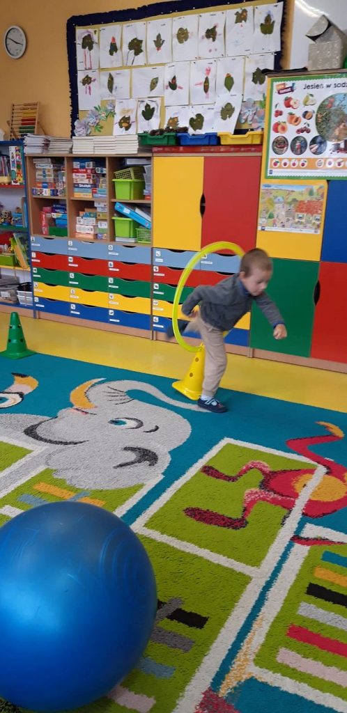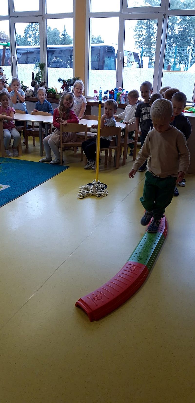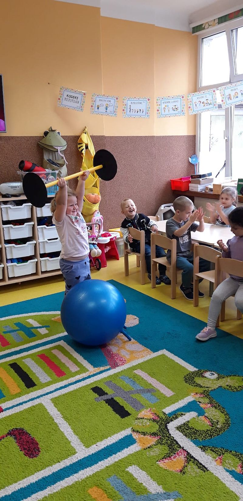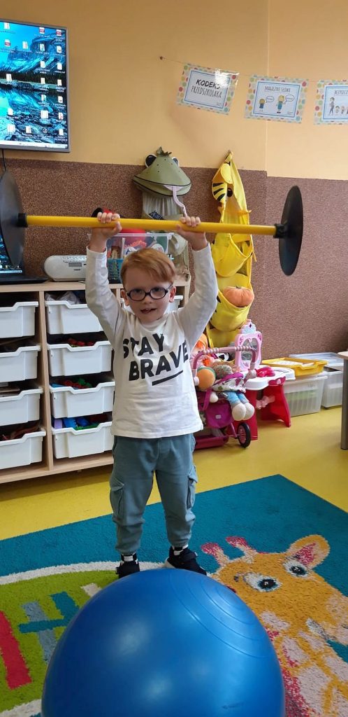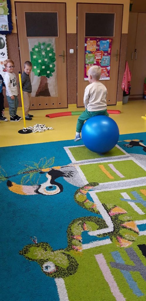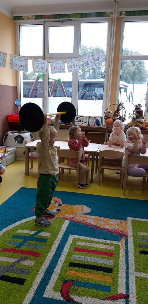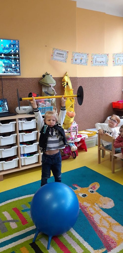 „skoki” na piłce, nakładanie obręczy oraz celowanie jabłkiem z „bibuły” do drzewka oraz podnoszenie sztangi:). Zabawy, radości i uśmiechu było mnóstwo. Każdy mógł się poczuć wyjątkowy i doceniony przez doping całej drużyny.
