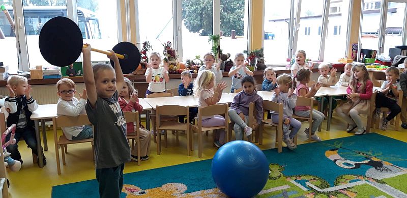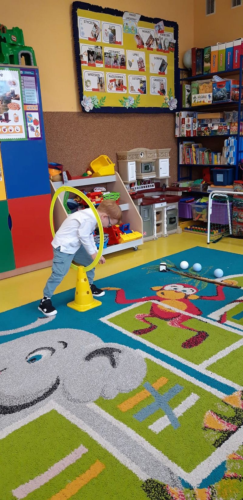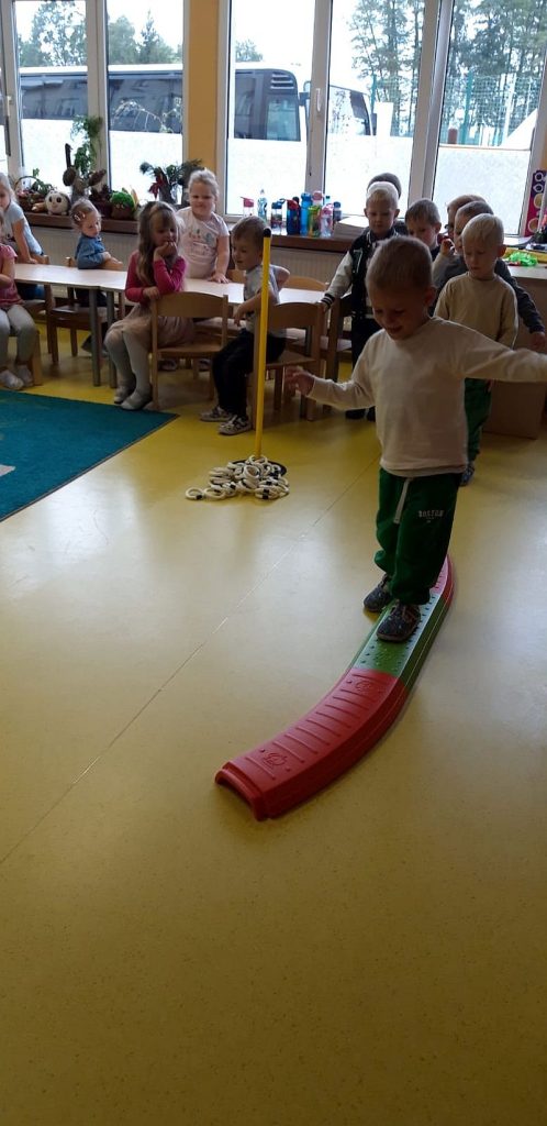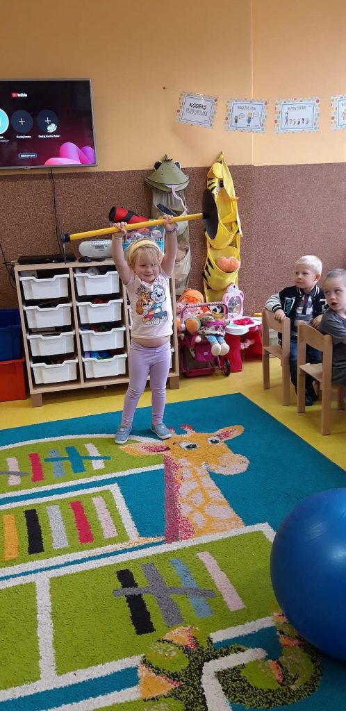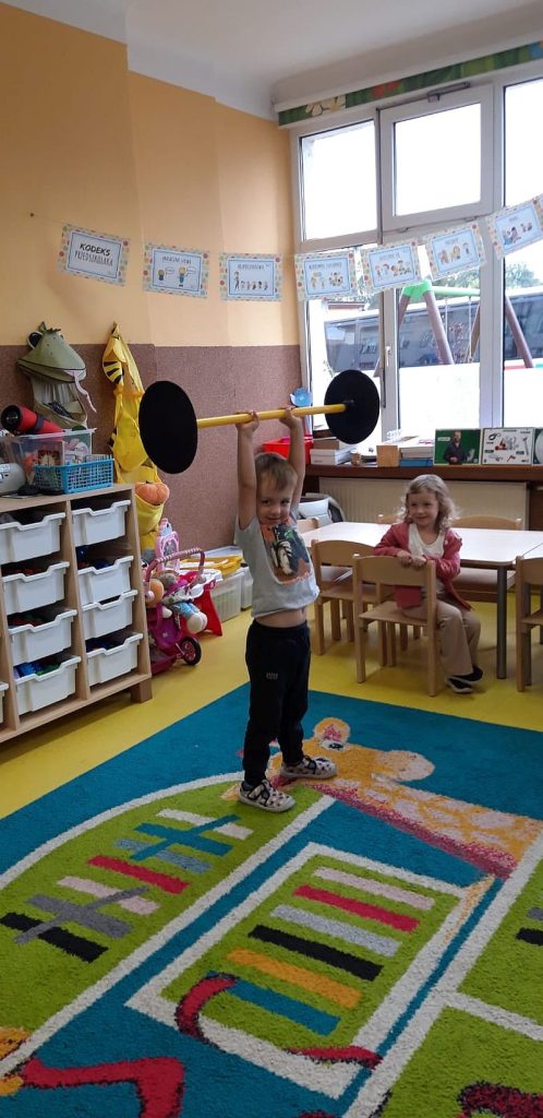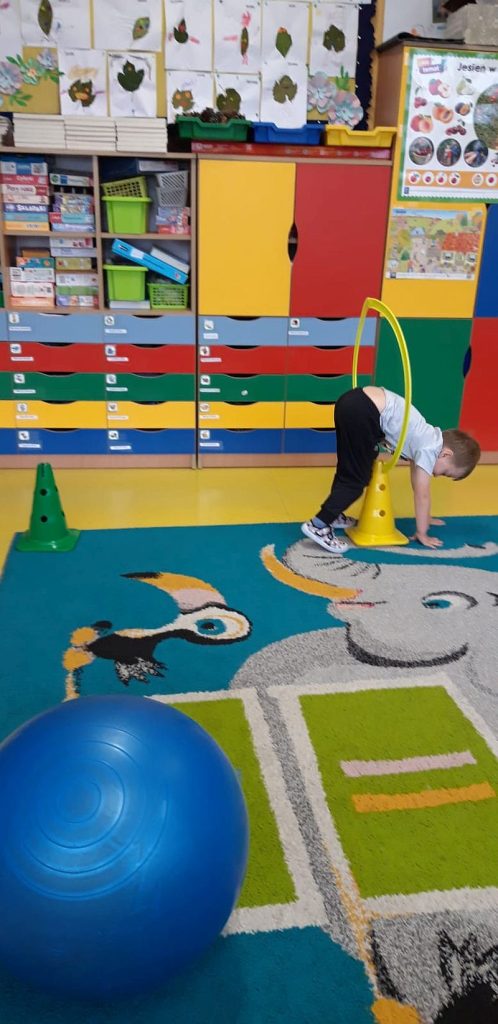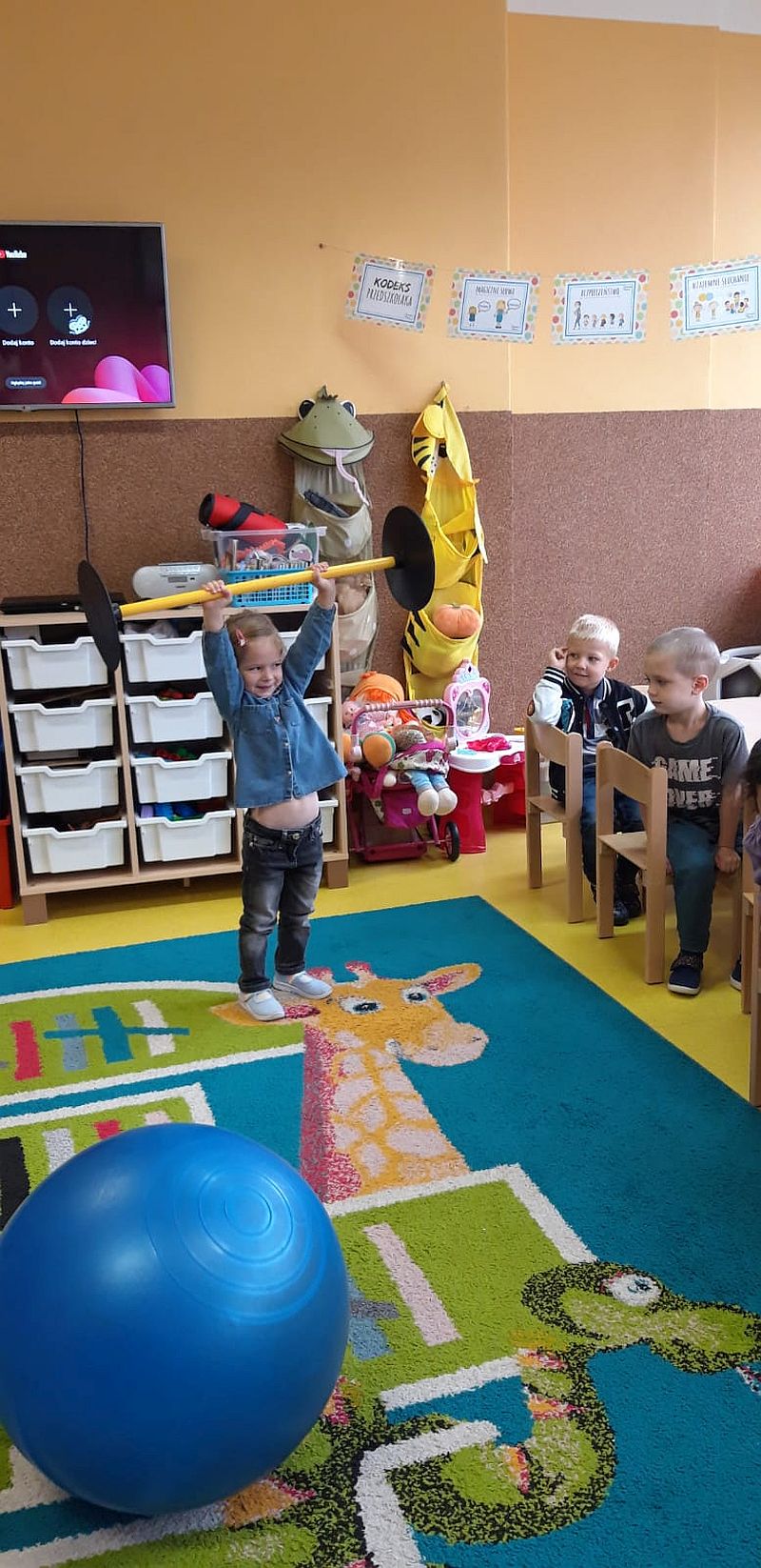 „skoki” na piłce, nakładanie obręczy oraz celowanie jabłkiem z „bibuły” do drzewka oraz podnoszenie sztangi:). Zabawy, radości i uśmiechu było mnóstwo. Każdy mógł się poczuć wyjątkowy i doceniony przez doping całej drużyny.