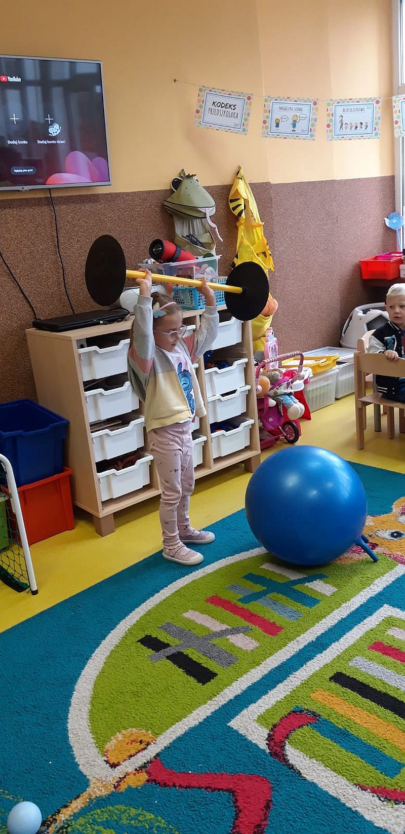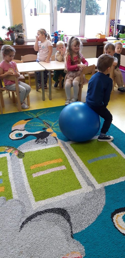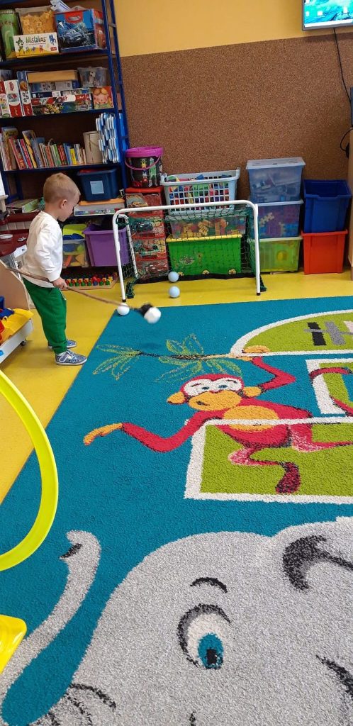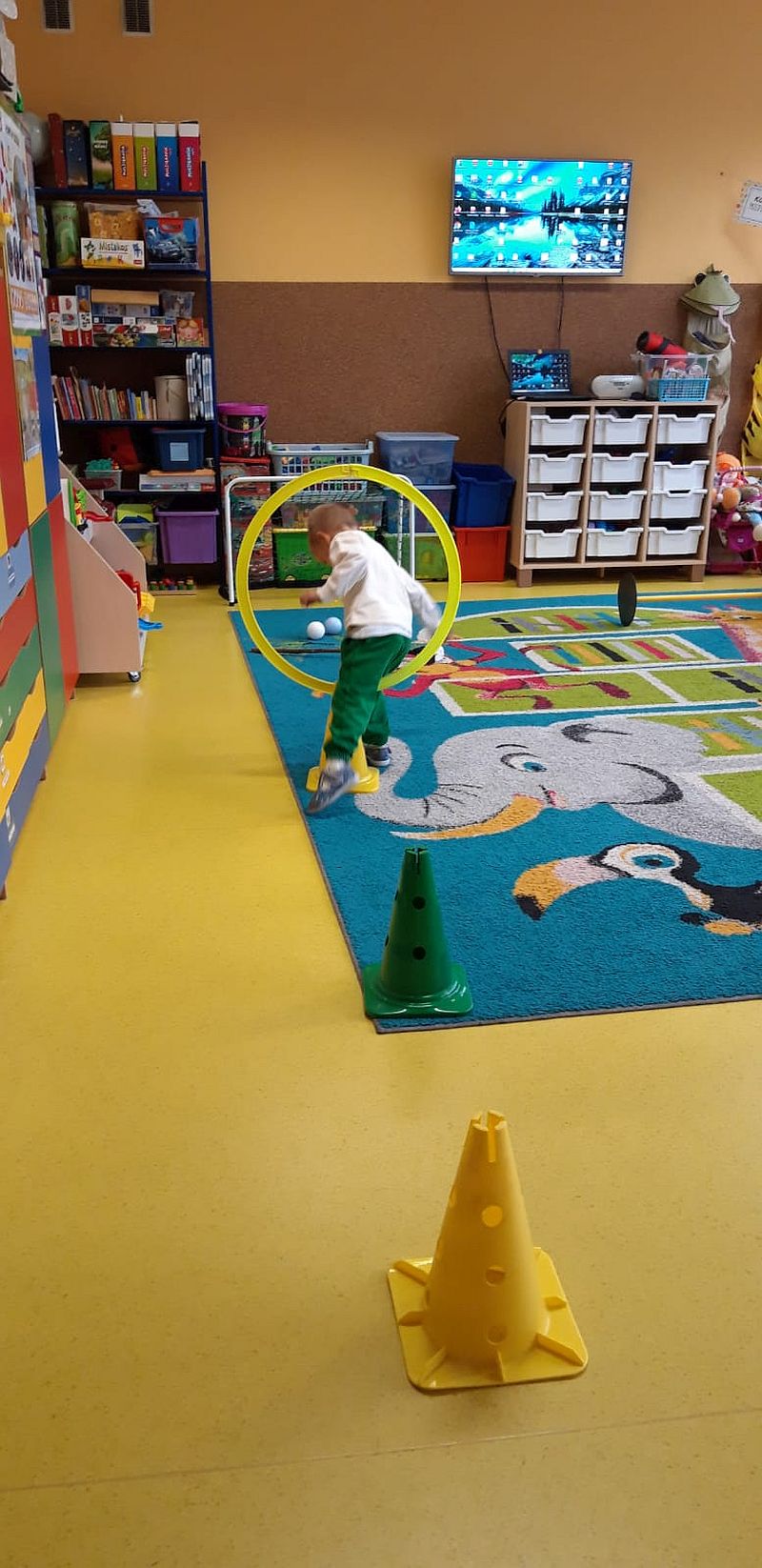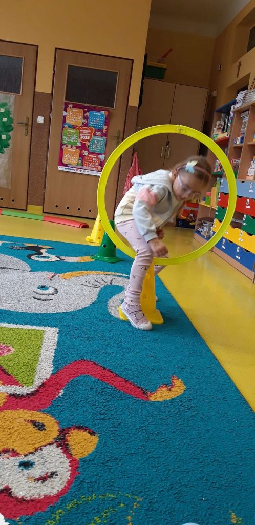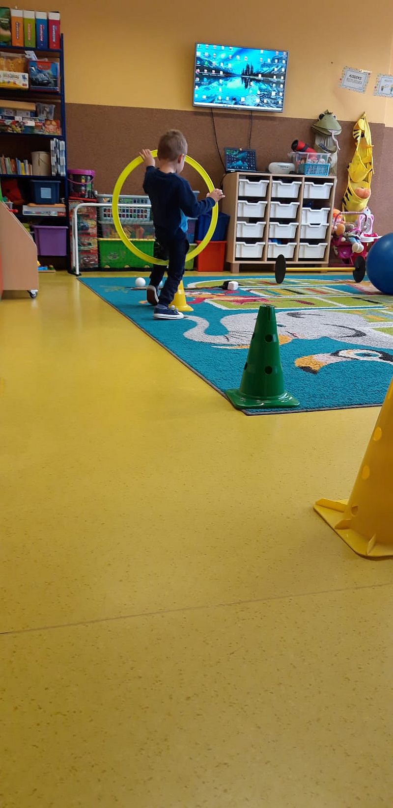 „skoki” na piłce, nakładanie obręczy oraz celowanie jabłkiem z „bibuły” do drzewka oraz podnoszenie sztangi:). Zabawy, radości i uśmiechu było mnóstwo. Każdy mógł się poczuć wyjątkowy i doceniony przez doping całej drużyny.
