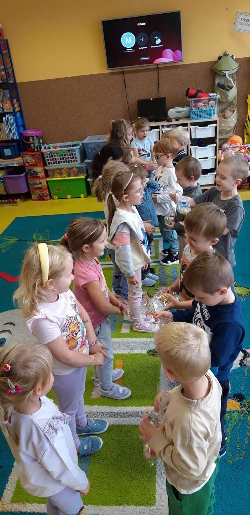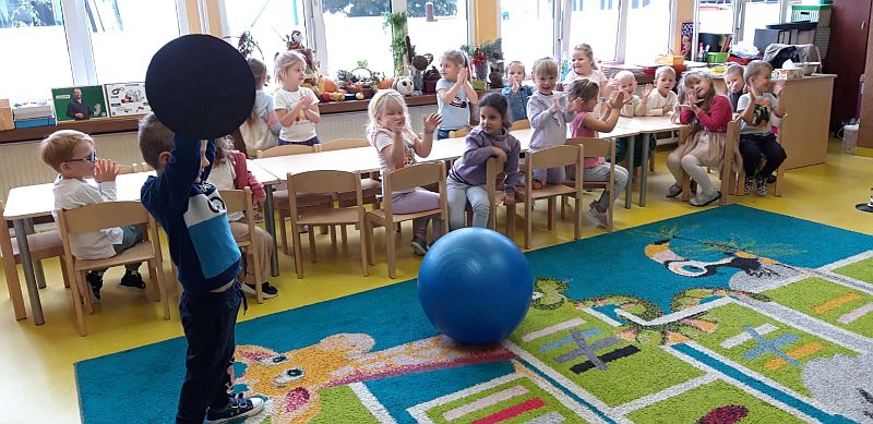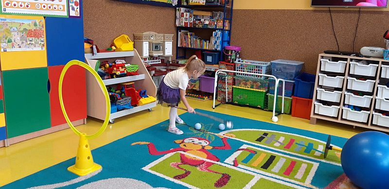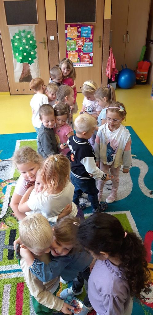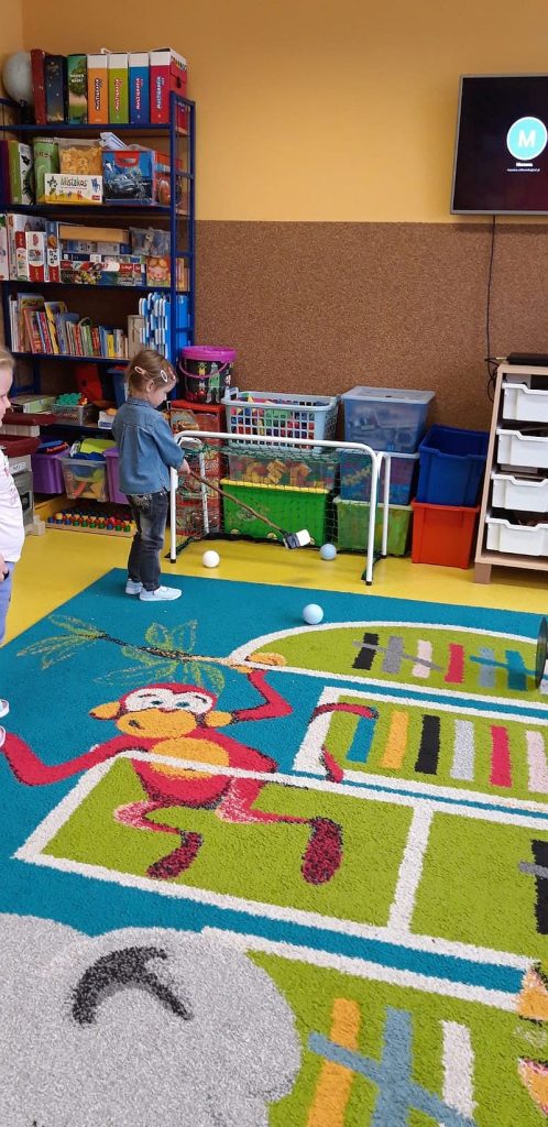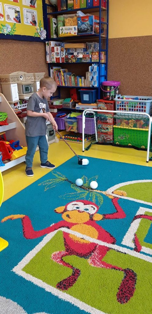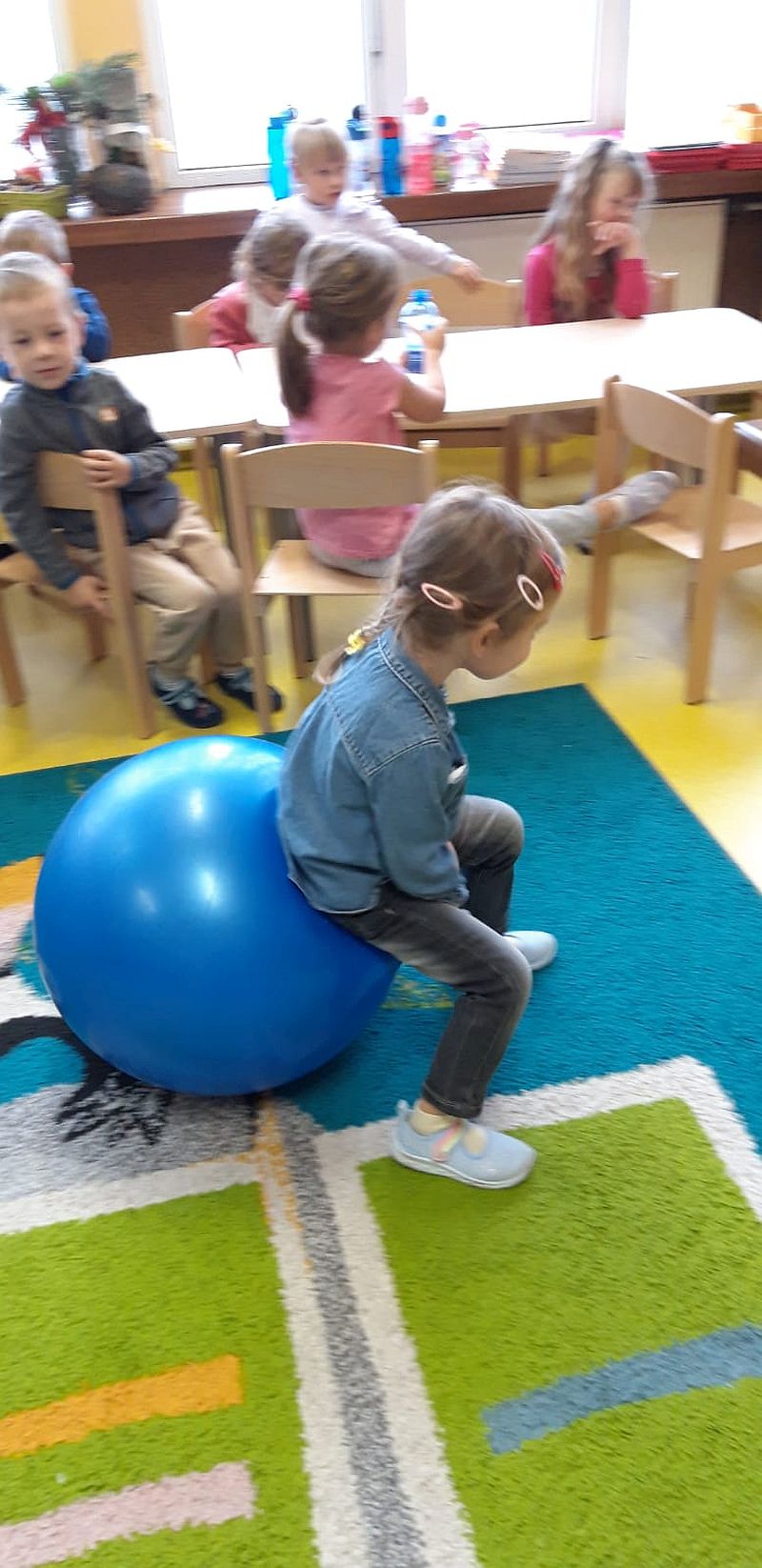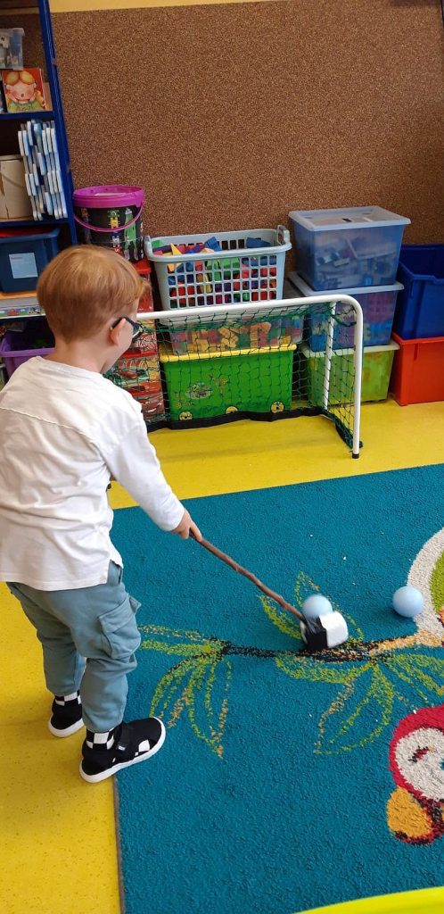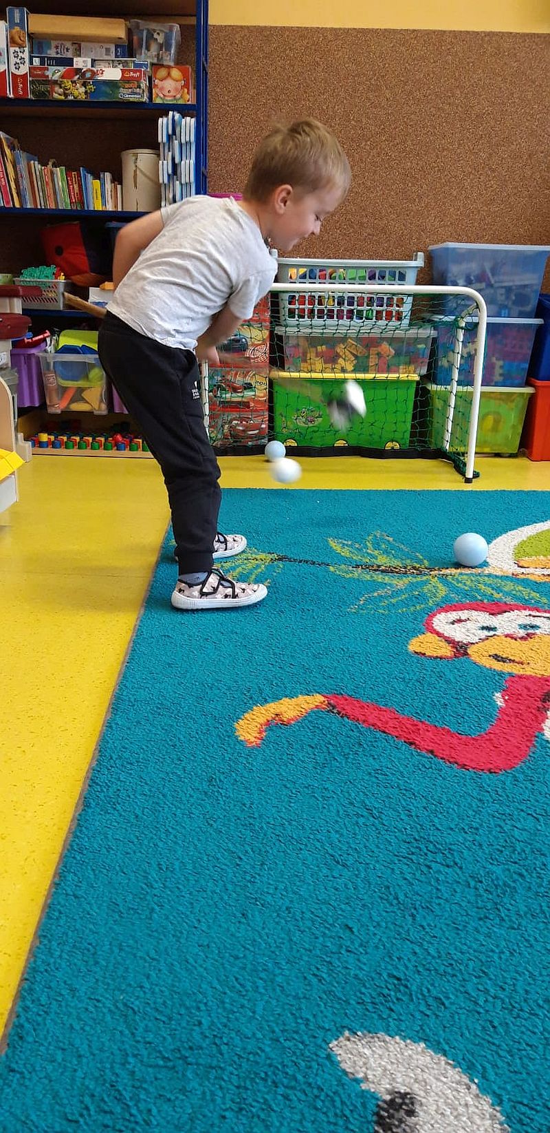 „skoki” na piłce, nakładanie obręczy oraz celowanie jabłkiem z „bibuły” do drzewka oraz podnoszenie sztangi:). Zabawy, radości i uśmiechu było mnóstwo. Każdy mógł się poczuć wyjątkowy i doceniony przez doping całej drużyny.