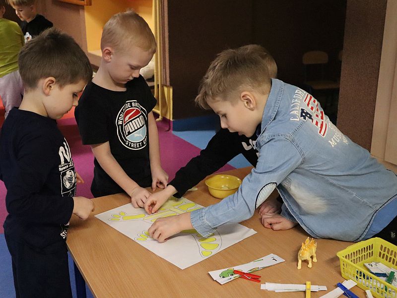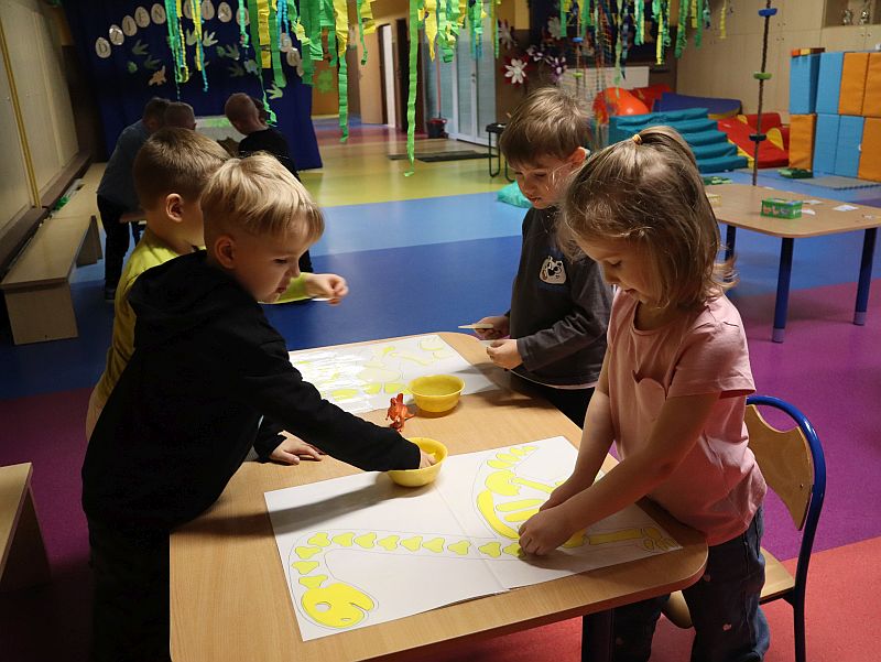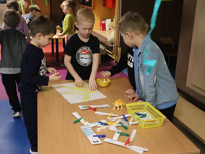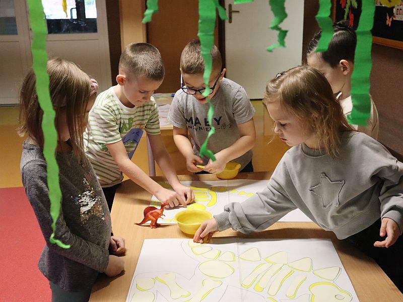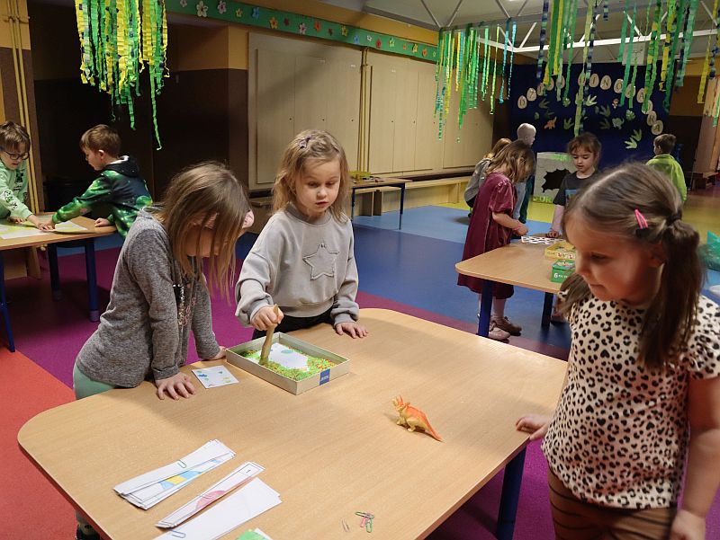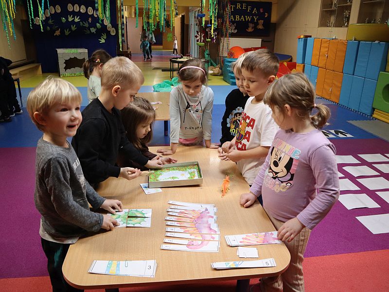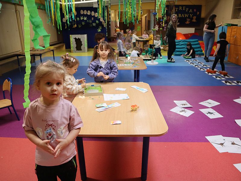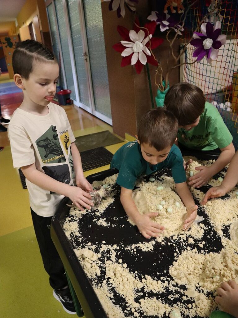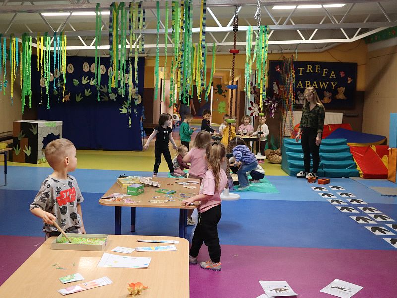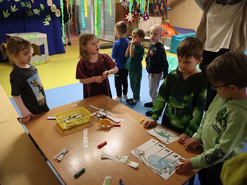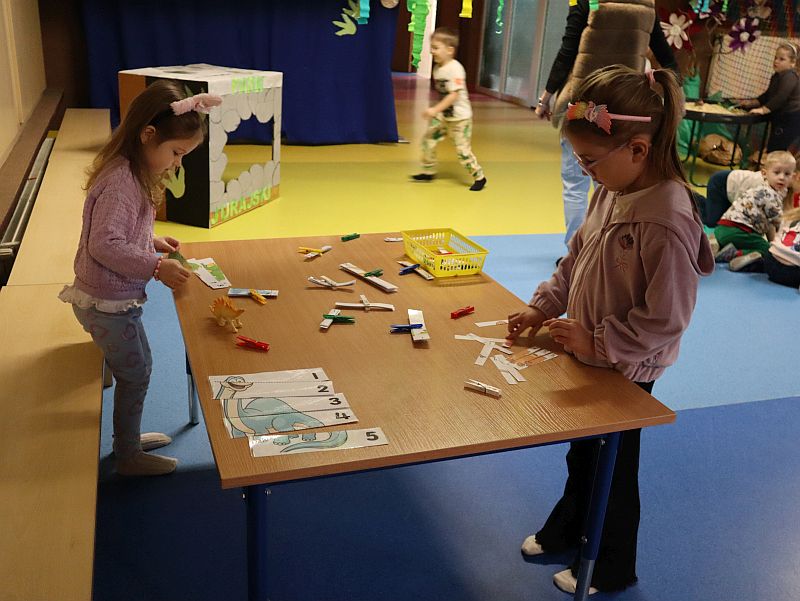 Dzień Dinozaura w przedszkolu był pełen radości i ciekawych aktywności. Dzieci brały udział w różnych zabawach związanych z dinozaurami. Układały puzzle, grały w grę Memory, a także uczestniczyły w „wykopaliskach”, podczas których odkrywały ukryte skamieniałości. Dużo radości sprawiła również fotobudka, w której mogły zrobić pamiątkowe zdjęcia w dinozaurowym klimacie. To był dzień pełen uśmiechu, zabawy i nowych odkryć.
