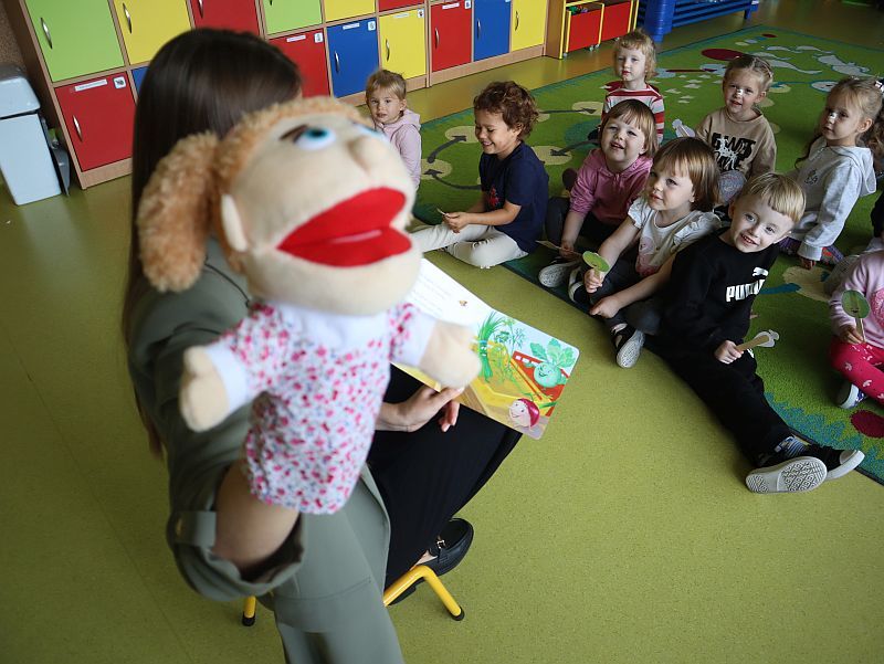 Odwiedziła nas również pacynka Zosia, która przeczytała dzieciom wiersz Jana Brzechwy „Na straganie”. Dzięki temu spotkaniu maluchy mogły poznać bliżej bohaterów wiersza i świetnie się bawić, odgrywając swoje warzywne role.