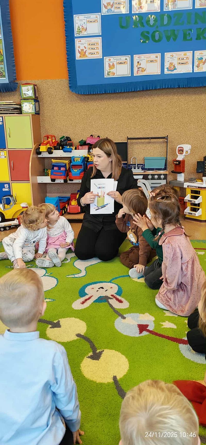 24.11.2025 w grupie Sówki obchodziliśmy Dzień Kredki. Na początku obejrzeliśmy film jak i z czego powstają kredki. Następnie wcieliliśmy się na chwilę w muzyków i zagraliśmy na kredkach piosenkę „Kolorowe kredki”. Potem dzieci pokonywały w parach tor w kształcie kredki, ćwicząc równowagę i motorykę dużą. Z wielkim zaciekawieniem dzieci słuchały bajki „Kredki” Magdaleny Niekry, w trakcie której odgadywały, co narysuje magiczna kredka, a na zakończenie zajęć kolorowały stworzony w trakcie bajki obrazek.