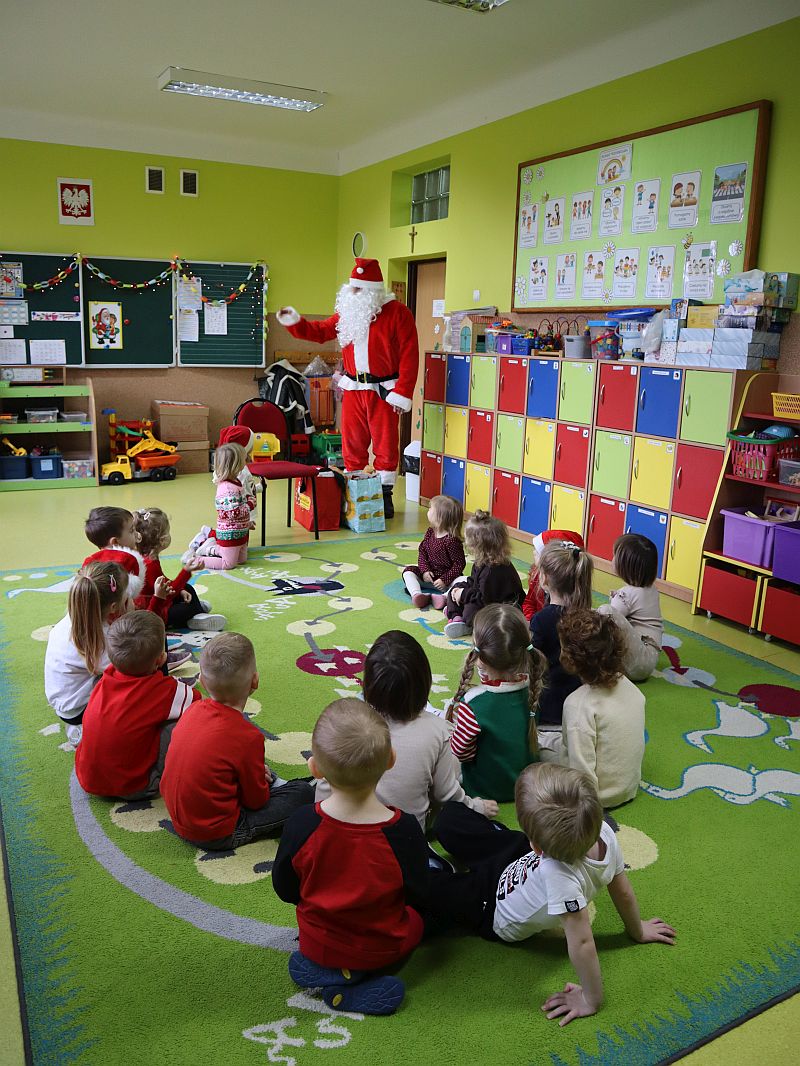 Zgodnie z tradycją w piątek 5 grudnia uroczyście obchodziliśmy w przedszkolu mikołajkowe święto. W dniu Mikołajek nasze przedszkolaki zamieniły się w pomocników Mikołaja i przyszły do przedszkola w czerwonych czapeczkach. Już od rana zastanawiały się czy Mikołaj odwiedzi ich salę i czy przyniesie prezenty. Po przyjściu Mikołaja dzieci przywitały się z niezwykłym gościem i zaprezentowały piosenki przygotowane specjalnie dla Niego. Mikołaj był zachwycony i rozdał wszystkim dzieciom prezenty.