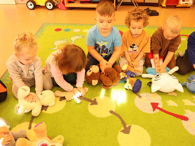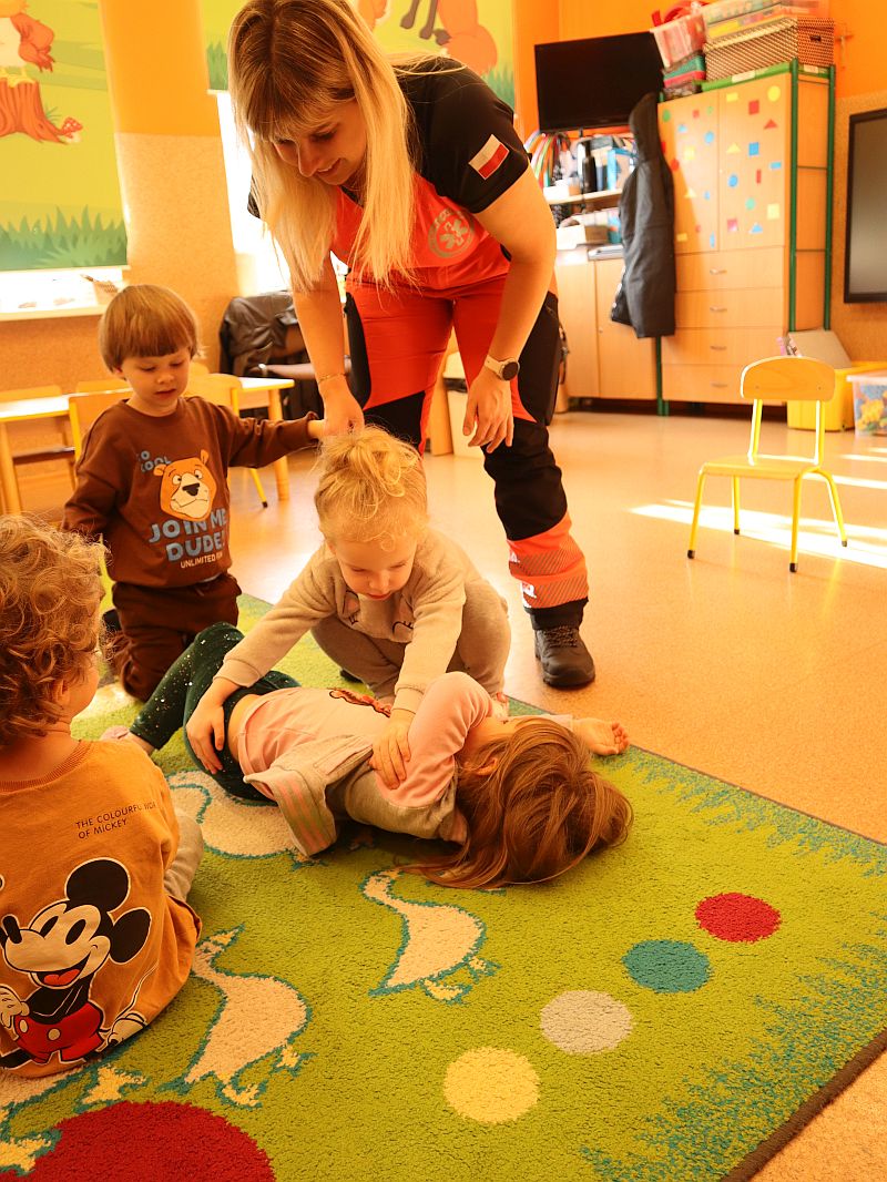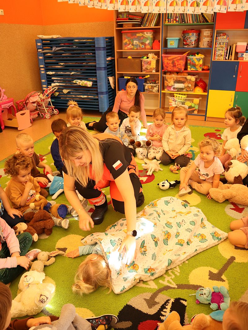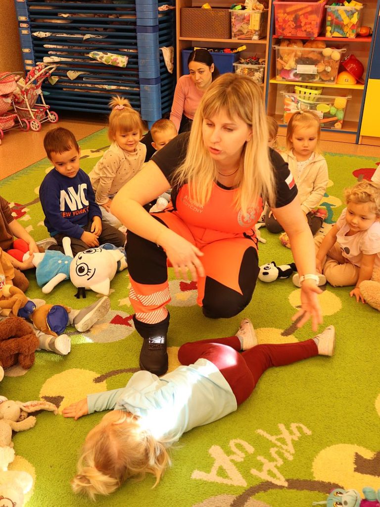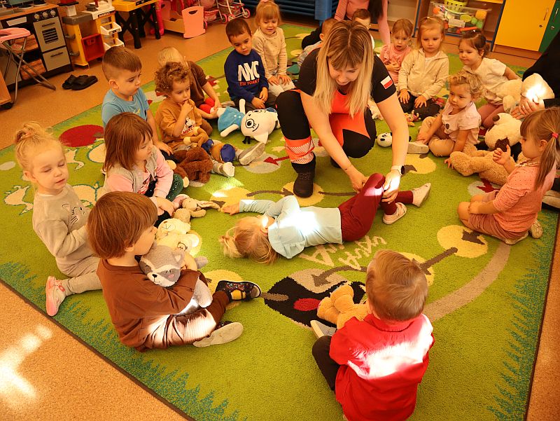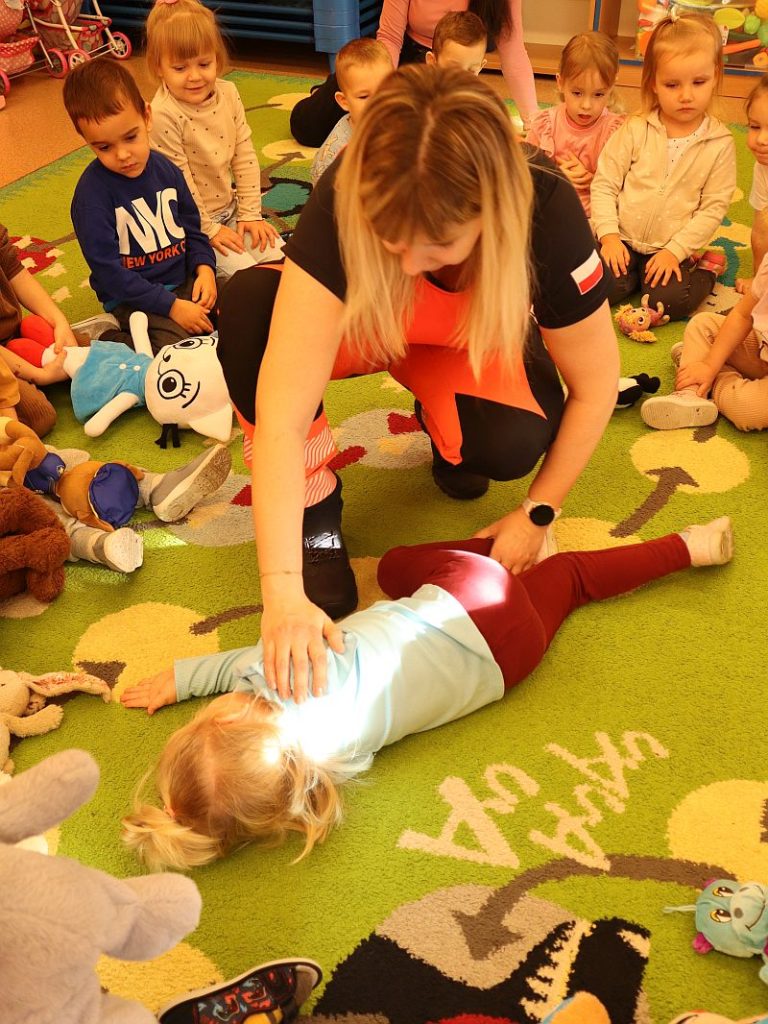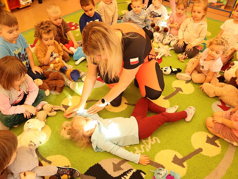 W grupie Sówki odbyły się wyjątkowe zajęcia, które przeprowadziła mama jednego z przedszkolaków- Pani Anna Rosińska. Na początku spotkania Pani Ania opowiedziała jak wygląda praca ratownika medycznego. Następnie wyjaśniła, co należy zrobić, gdy spotka się nieprzytomną osobę – jak sprawdzić czy reaguje, jak wezwać pomoc oraz w jakich sytuacjach należy dzwonić pod numer 112. Dzieci dowiedziały się także, jakie informacje trzeba przekazać dyspozytorowi, aby karetka mogła dotrzeć jak najszybciej na miejsce. W dalszej części zajęć przedszkolaki miały okazję wcielić się w małych ratowników. Na swoich pluszowych misiach uczyły się udzielać pierwszej pomocy. Zajęcia były bardzo ciekawe i pouczające. Dzieci z dużym zaangażowaniem uczestniczyły w ćwiczeniach i zrozumiały jak ważne jest, by pomagać innym i nie bać się reagować w sytuacjach zagrożenia.