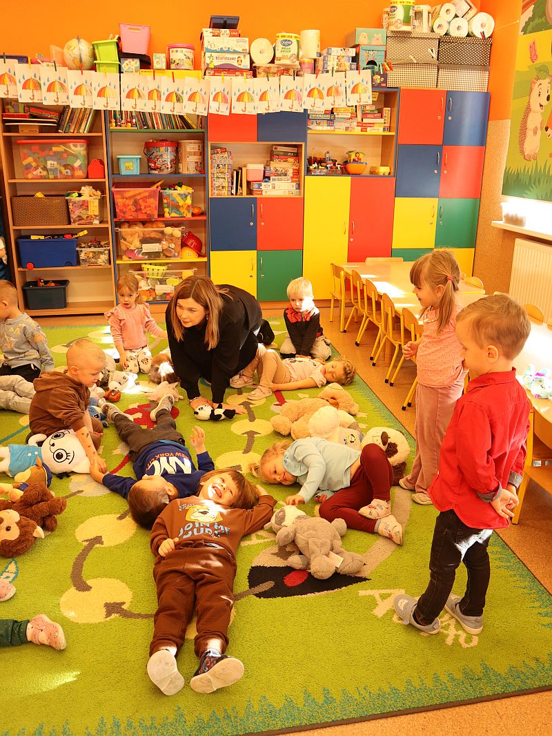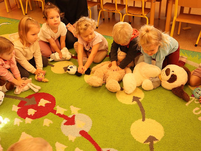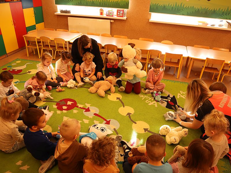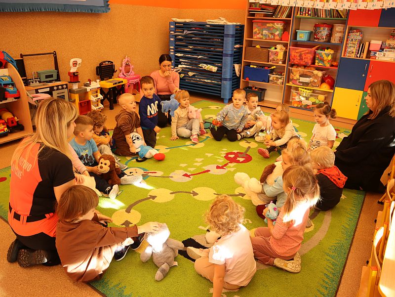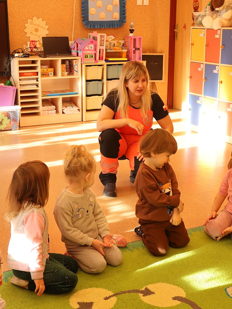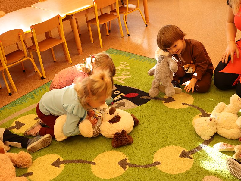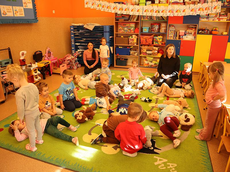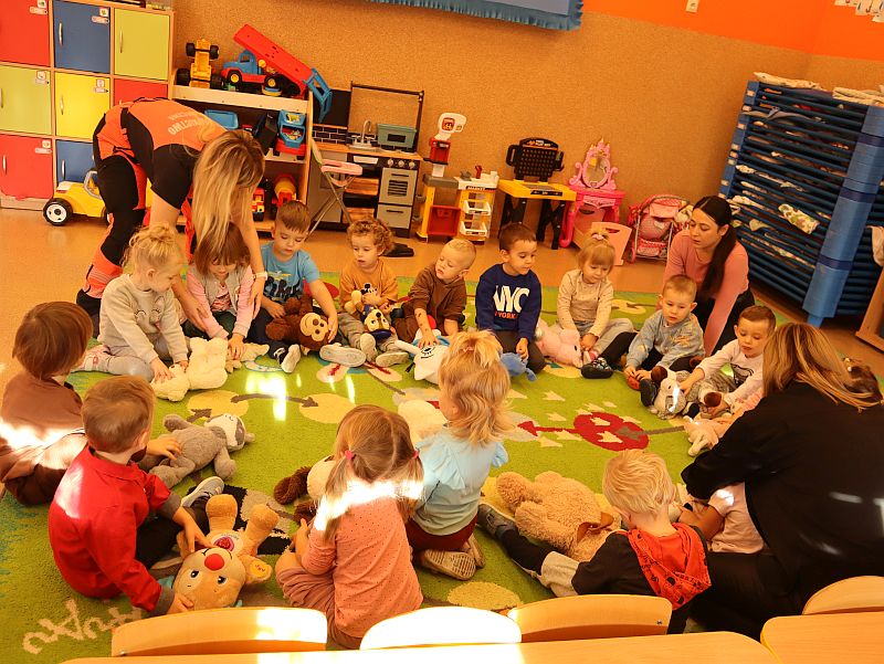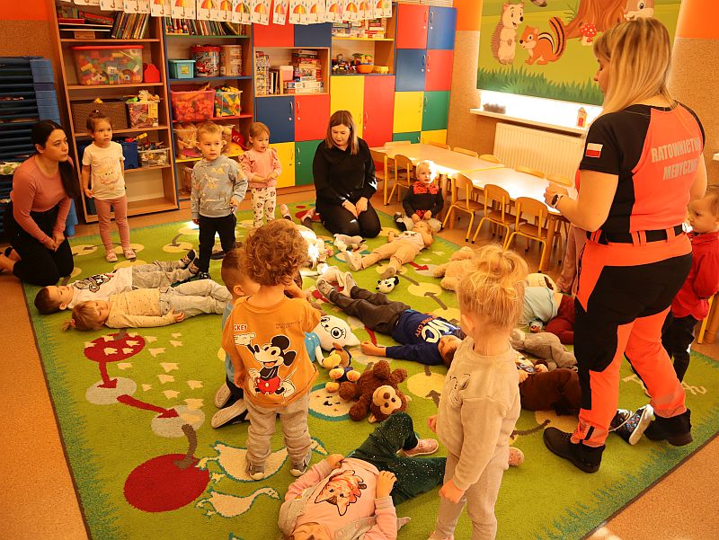 W grupie Sówki odbyły się wyjątkowe zajęcia, które przeprowadziła mama jednego z przedszkolaków- Pani Anna Rosińska. Na początku spotkania Pani Ania opowiedziała jak wygląda praca ratownika medycznego. Następnie wyjaśniła, co należy zrobić, gdy spotka się nieprzytomną osobę – jak sprawdzić czy reaguje, jak wezwać pomoc oraz w jakich sytuacjach należy dzwonić pod numer 112. Dzieci dowiedziały się także, jakie informacje trzeba przekazać dyspozytorowi, aby karetka mogła dotrzeć jak najszybciej na miejsce. W dalszej części zajęć przedszkolaki miały okazję wcielić się w małych ratowników. Na swoich pluszowych misiach uczyły się udzielać pierwszej pomocy. Zajęcia były bardzo ciekawe i pouczające. Dzieci z dużym zaangażowaniem uczestniczyły w ćwiczeniach i zrozumiały jak ważne jest, by pomagać innym i nie bać się reagować w sytuacjach zagrożenia.