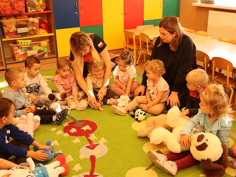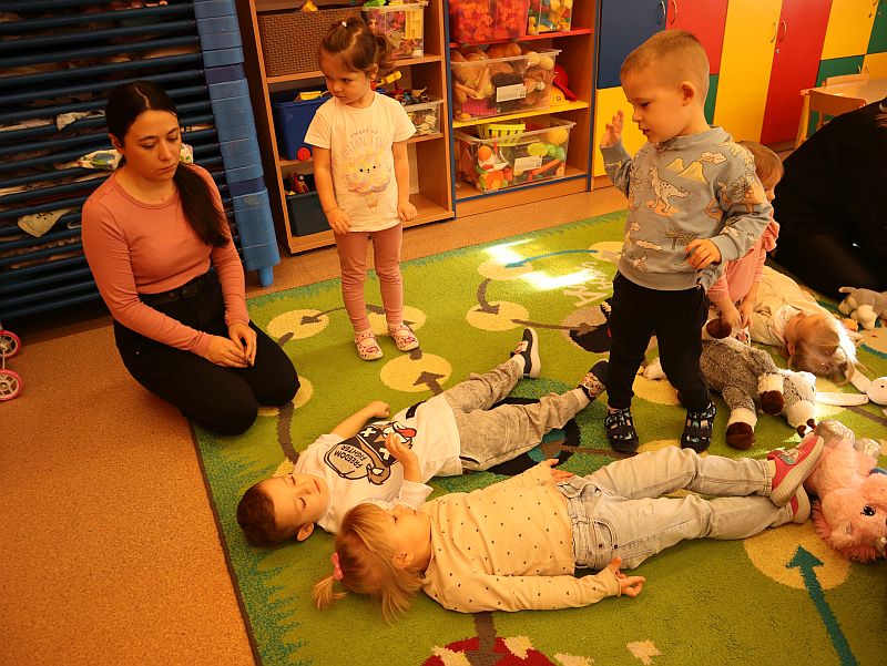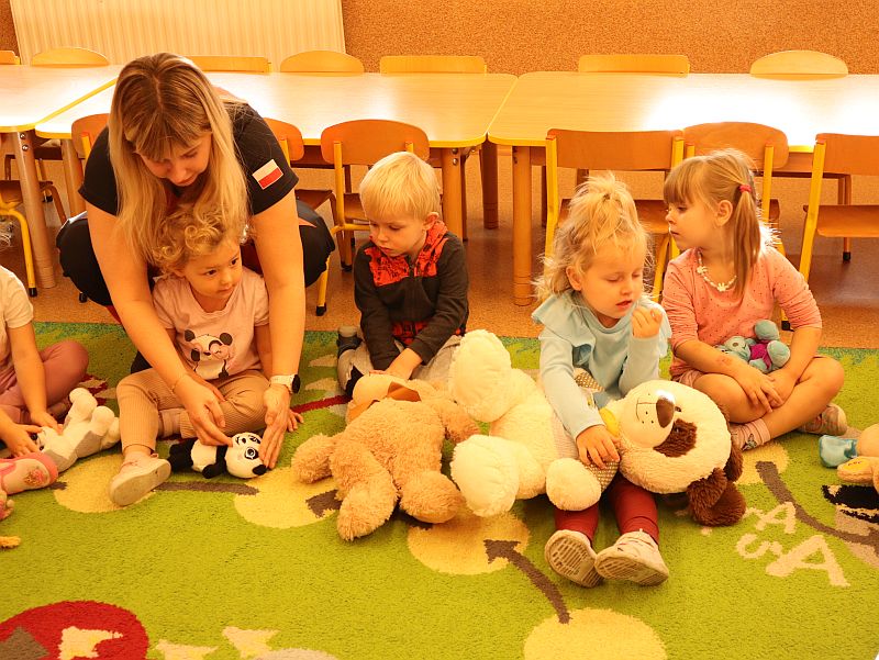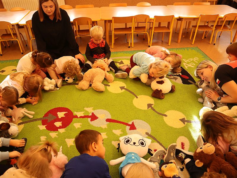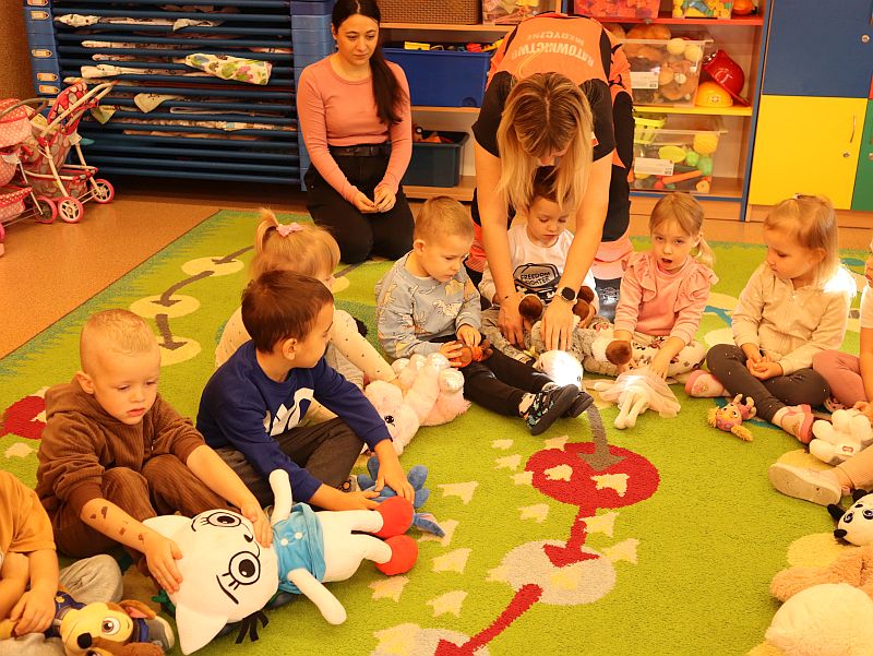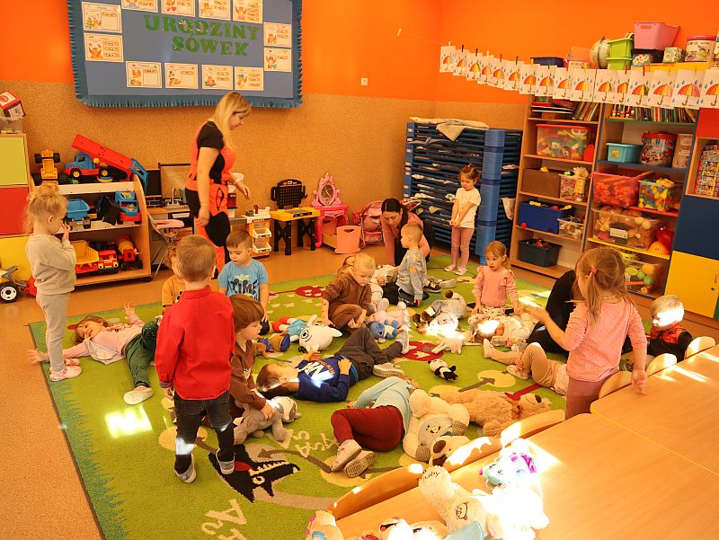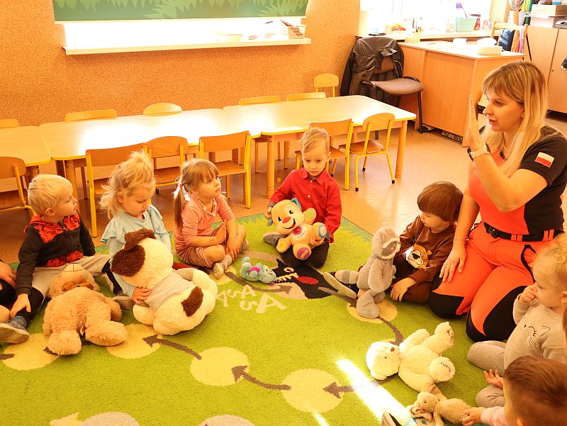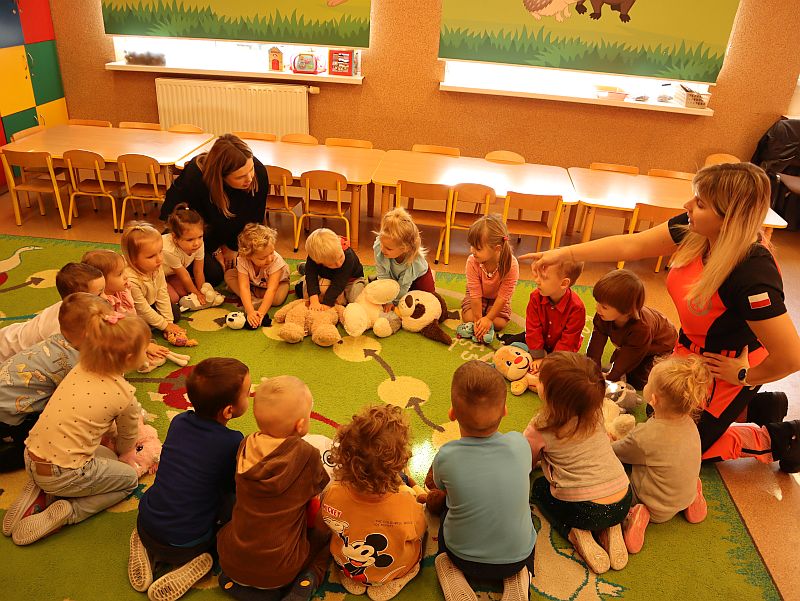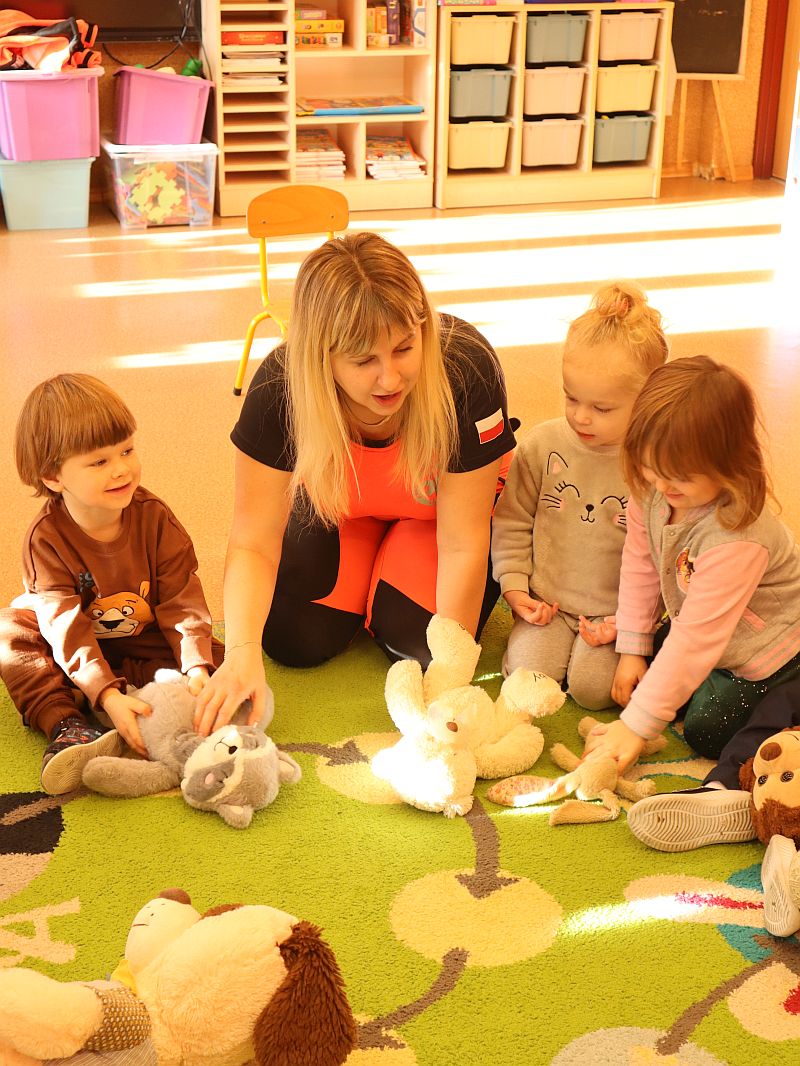 W grupie Sówki odbyły się wyjątkowe zajęcia, które przeprowadziła mama jednego z przedszkolaków- Pani Anna Rosińska. Na początku spotkania Pani Ania opowiedziała jak wygląda praca ratownika medycznego. Następnie wyjaśniła, co należy zrobić, gdy spotka się nieprzytomną osobę – jak sprawdzić czy reaguje, jak wezwać pomoc oraz w jakich sytuacjach należy dzwonić pod numer 112. Dzieci dowiedziały się także, jakie informacje trzeba przekazać dyspozytorowi, aby karetka mogła dotrzeć jak najszybciej na miejsce. W dalszej części zajęć przedszkolaki miały okazję wcielić się w małych ratowników. Na swoich pluszowych misiach uczyły się udzielać pierwszej pomocy. Zajęcia były bardzo ciekawe i pouczające. Dzieci z dużym zaangażowaniem uczestniczyły w ćwiczeniach i zrozumiały jak ważne jest, by pomagać innym i nie bać się reagować w sytuacjach zagrożenia.