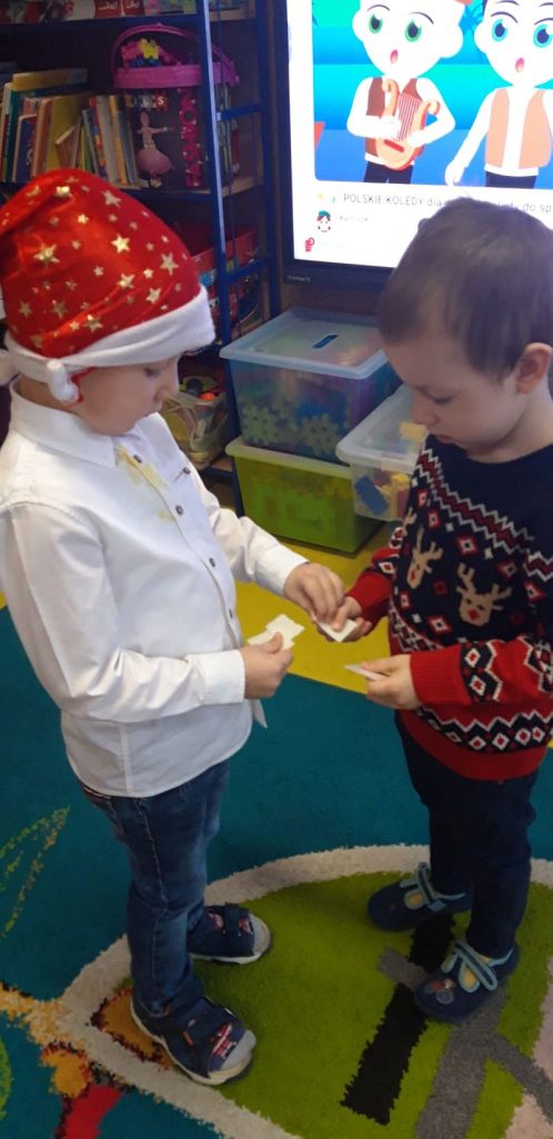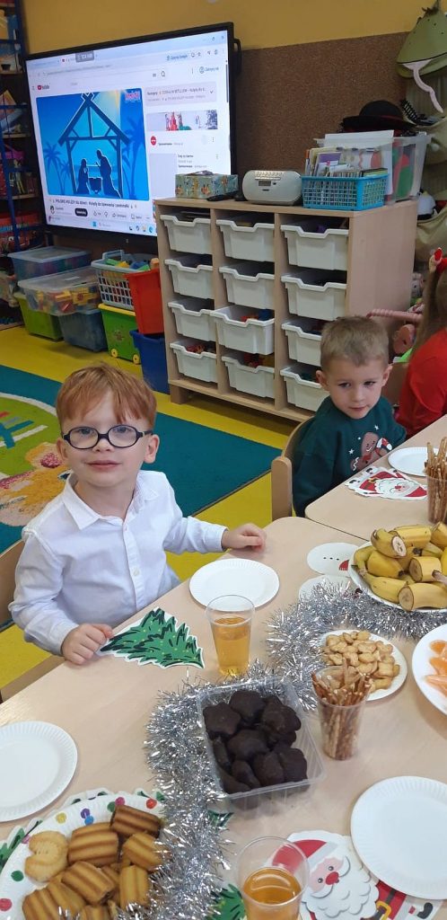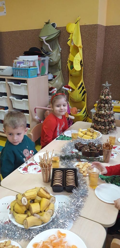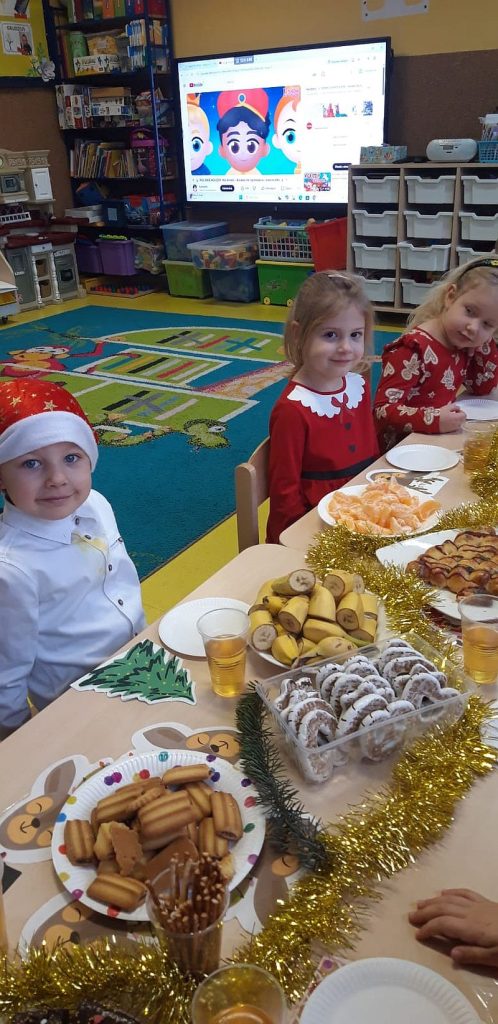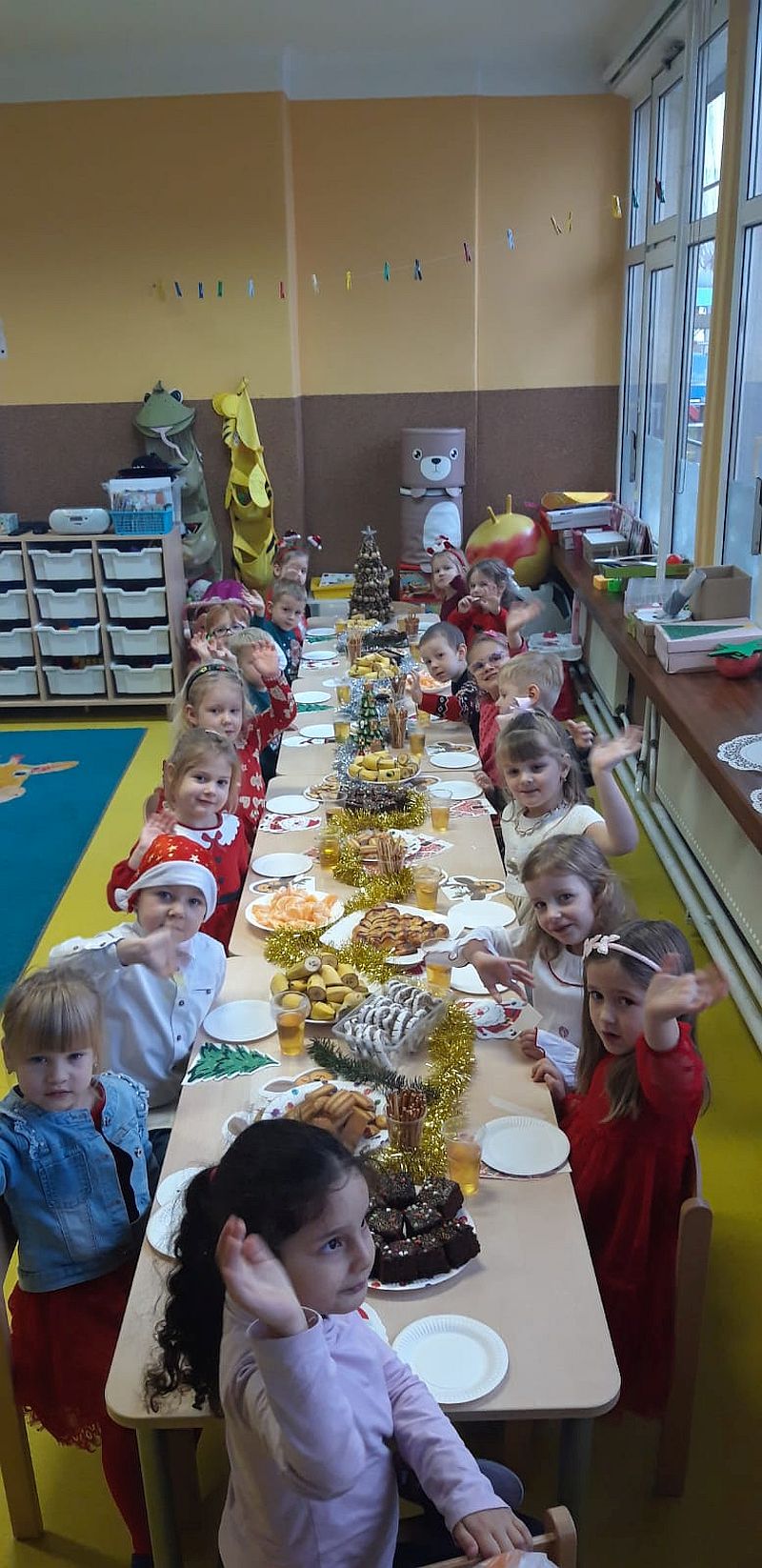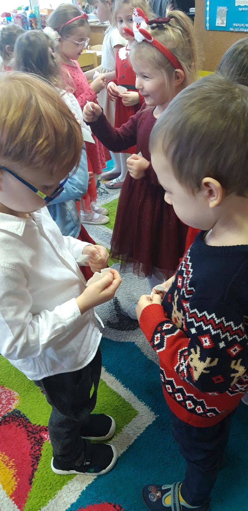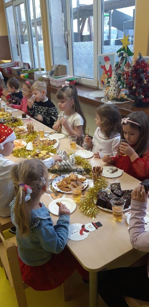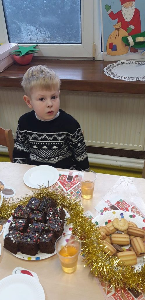 Zaśpiewaliśmy kolędy, złożyliśmy życzenia i podzieliliśmy się opłatkiem. Na zakończenie usiedliśmy do stołu i zajadaliśmy się smakołykami. Podziękowania dla rodziców za przygotowanie poczęstunku.