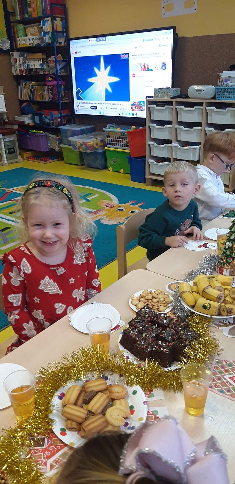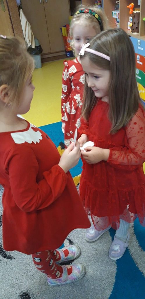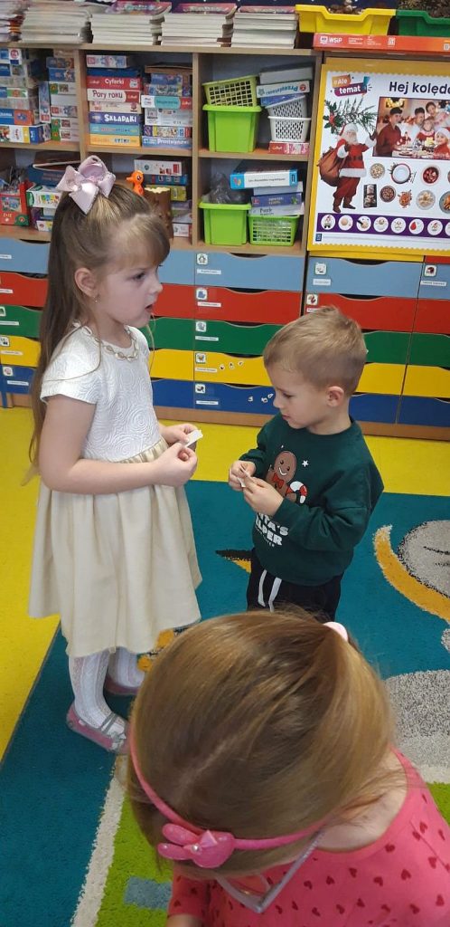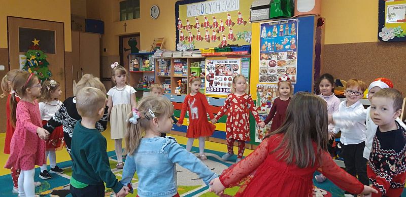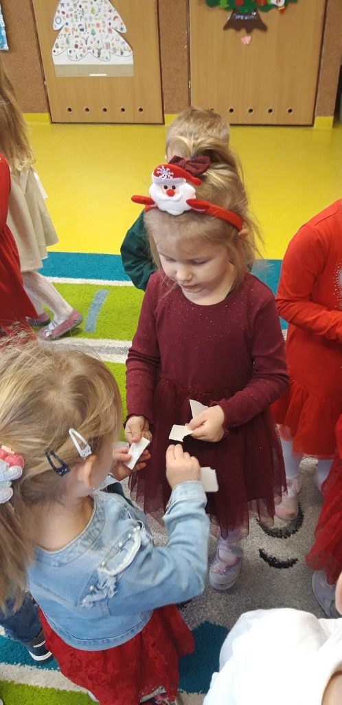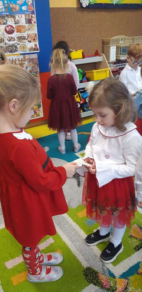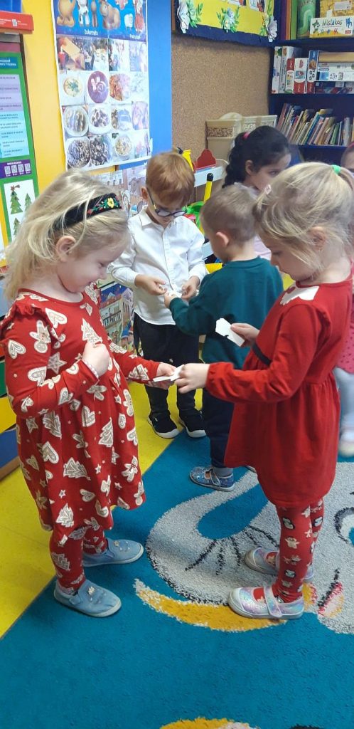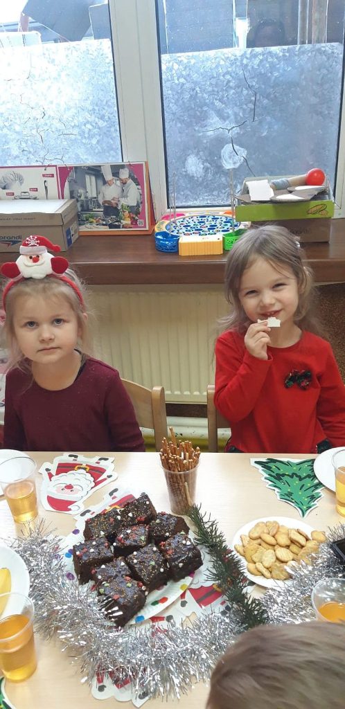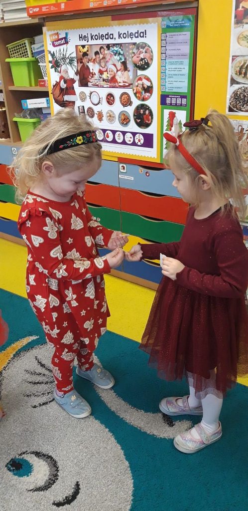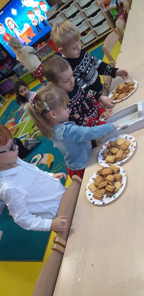 Zaśpiewaliśmy kolędy, złożyliśmy życzenia i podzieliliśmy się opłatkiem. Na zakończenie usiedliśmy do stołu i zajadaliśmy się smakołykami. Podziękowania dla rodziców za przygotowanie poczęstunku.