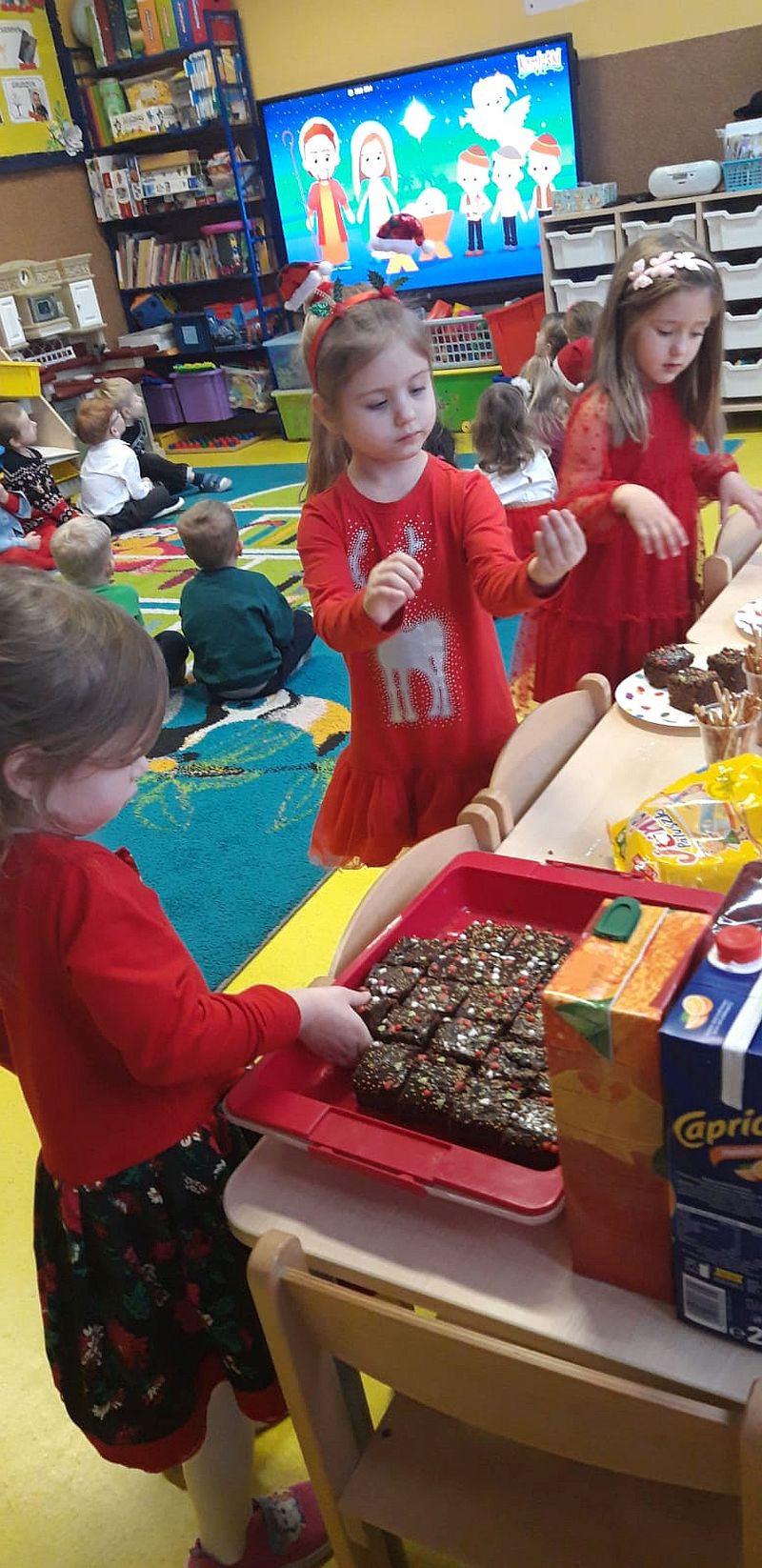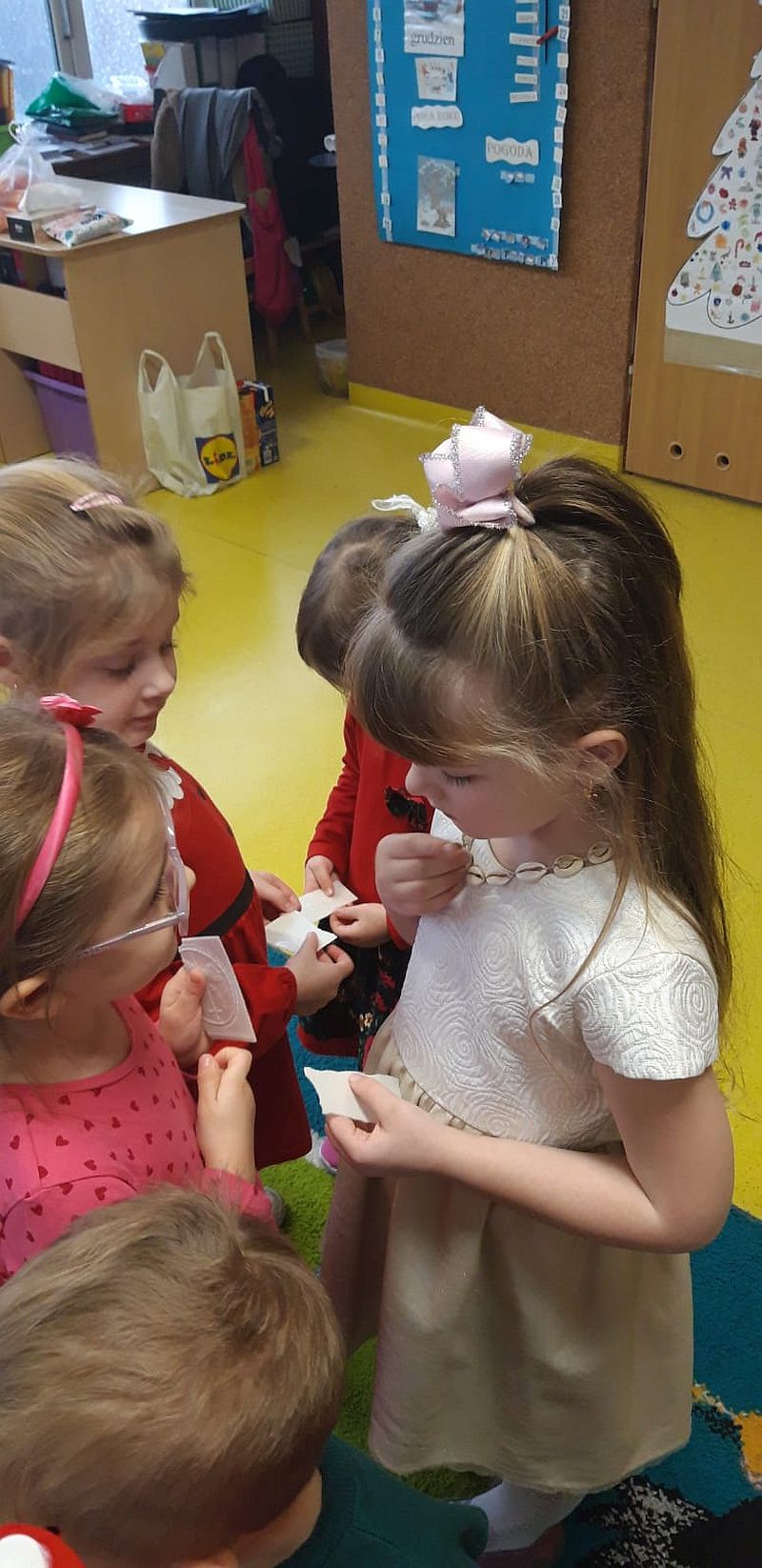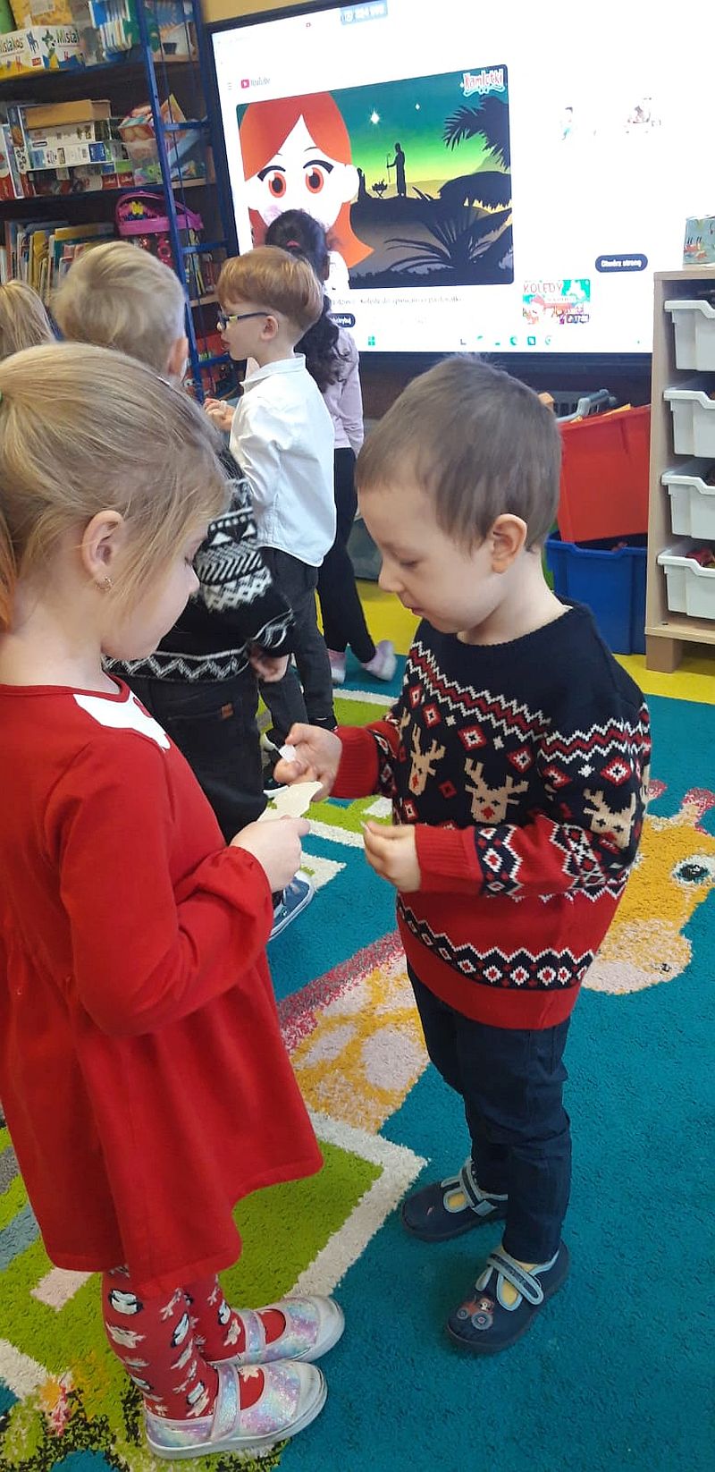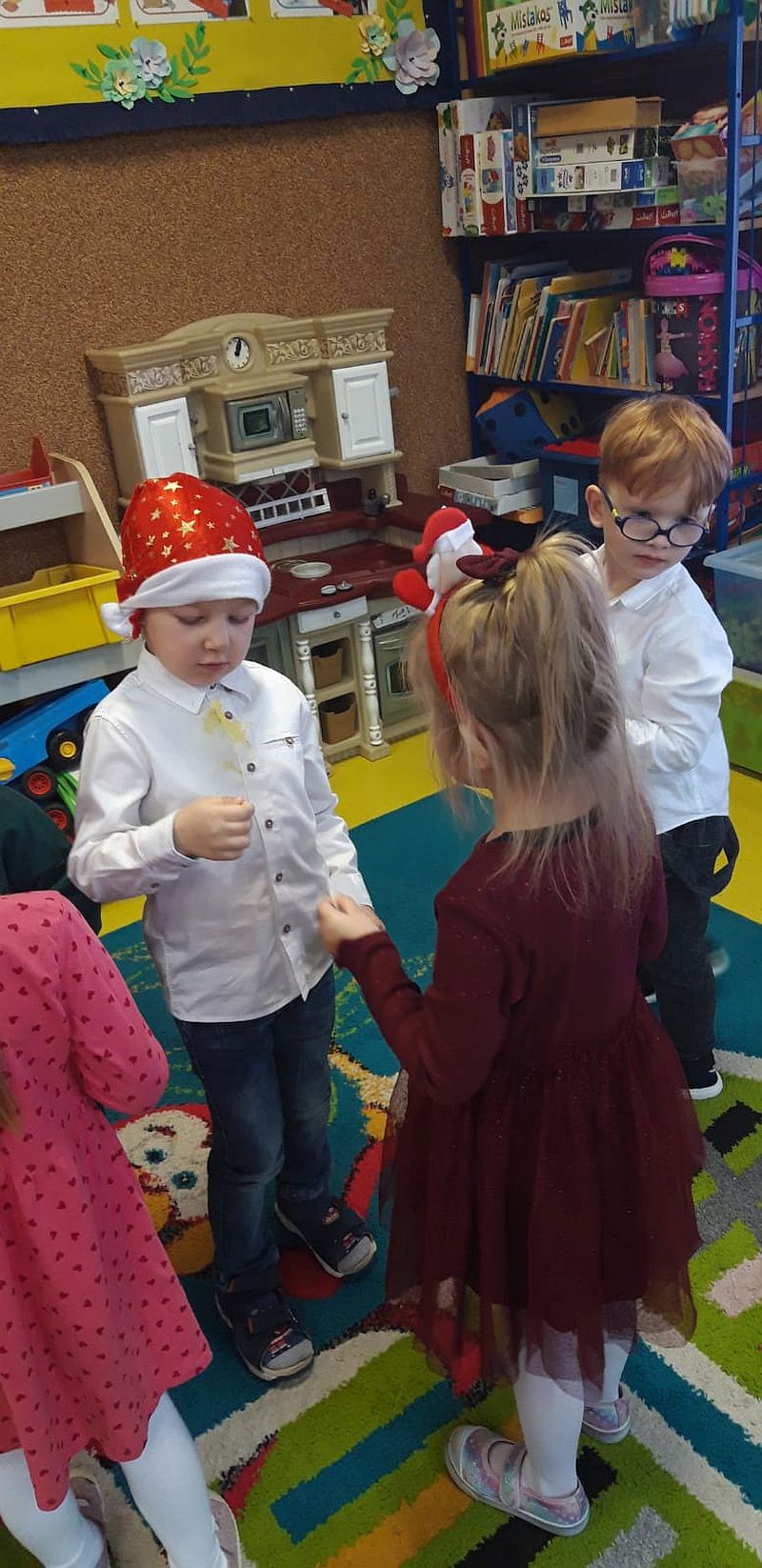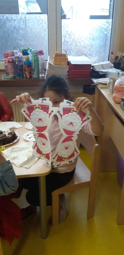 Zaśpiewaliśmy kolędy, złożyliśmy życzenia i podzieliliśmy się opłatkiem. Na zakończenie usiedliśmy do stołu i zajadaliśmy się smakołykami. Podziękowania dla rodziców za przygotowanie poczęstunku.