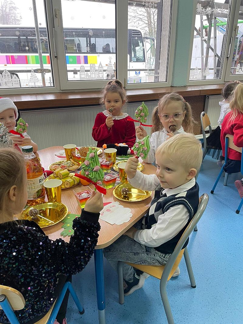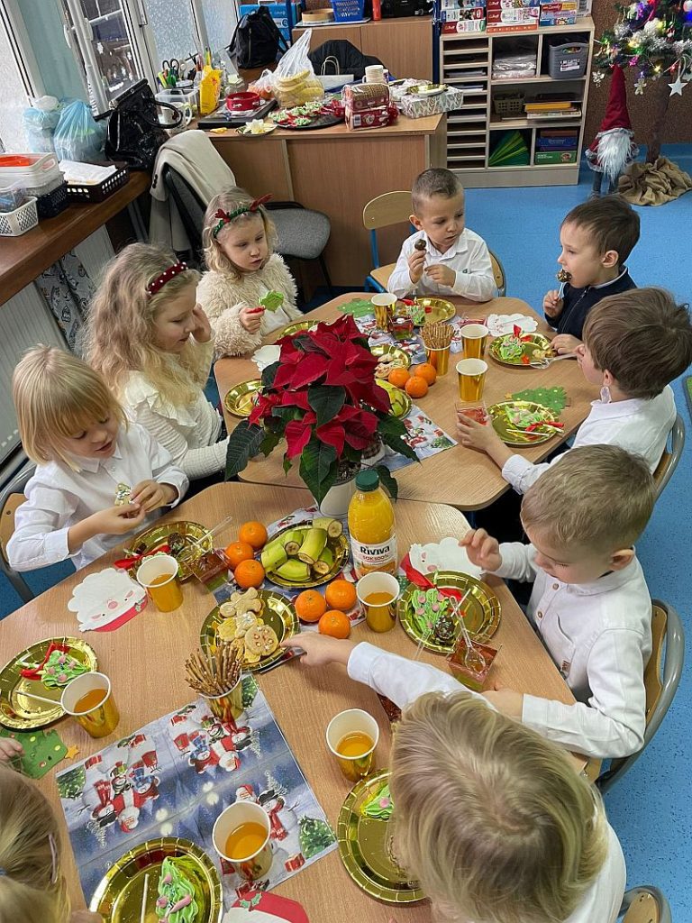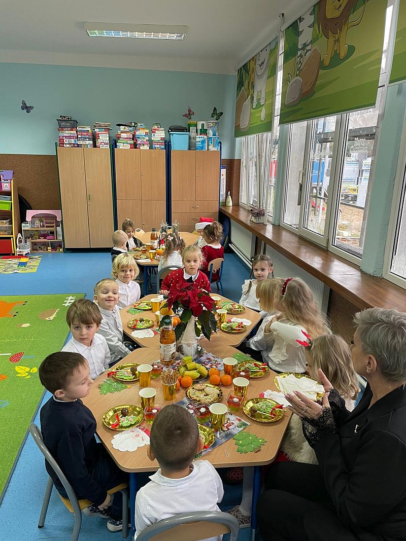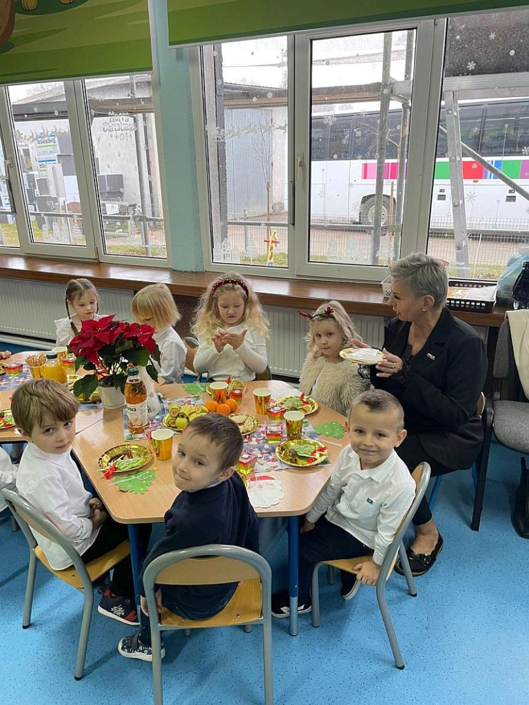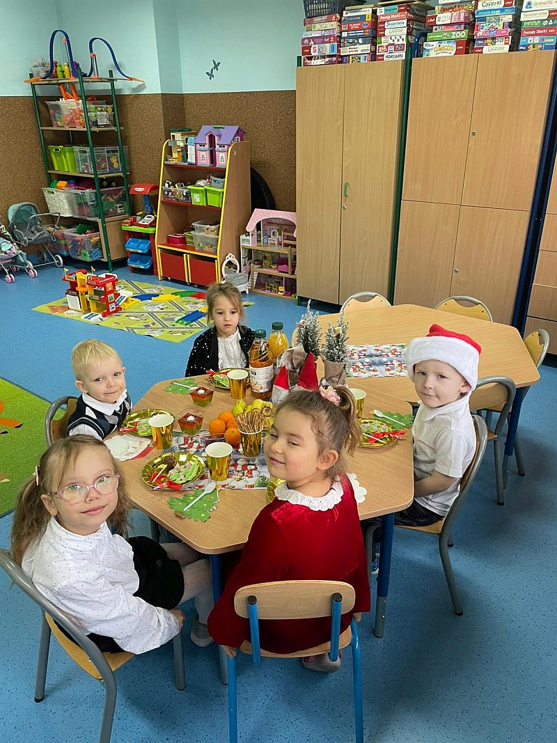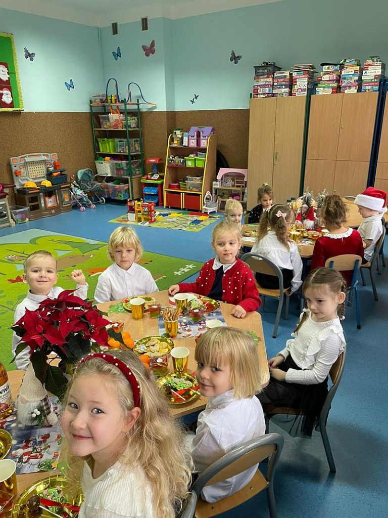 W grupie „Motylki” obchodziliśmy jeden z najpiękniejszych dni w roku – Wigilię Bożego Narodzenia. Dzieci dzieliły się opłatkiem, składały sobie życzenia, a następnie zasiadły do pięknie przystrojonego stołu, na którym czekał słodki poczęstunek. Nie zabrakło również wspólnego kolędowania. Czas upłynął w bardzo miłej atmosferze. Wszystkie dzieci czuły zbliżające się wielkimi krokami Święta Bożego Narodzenia.