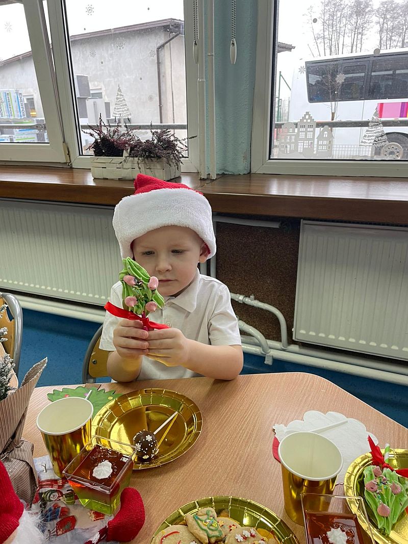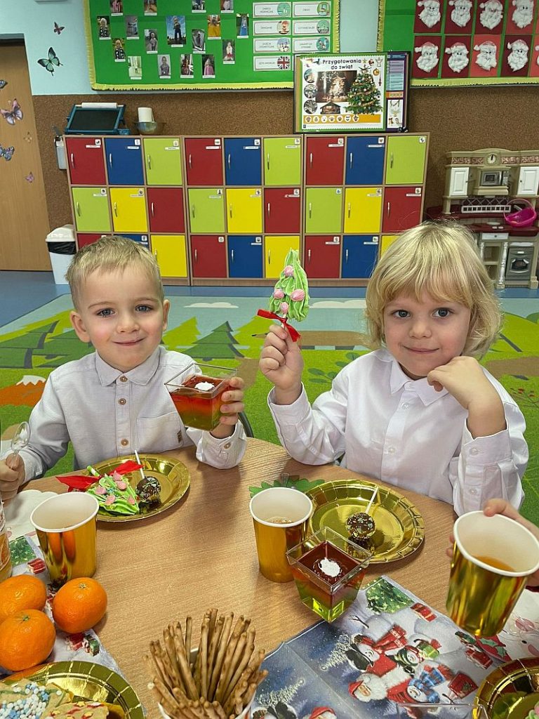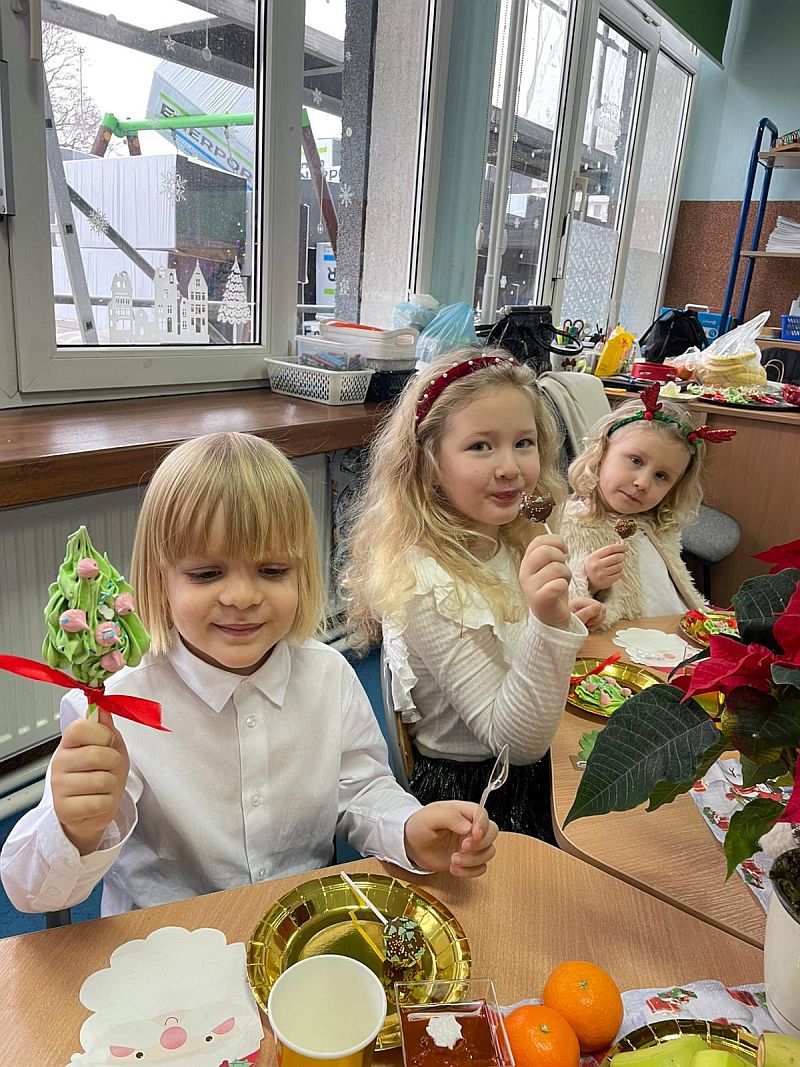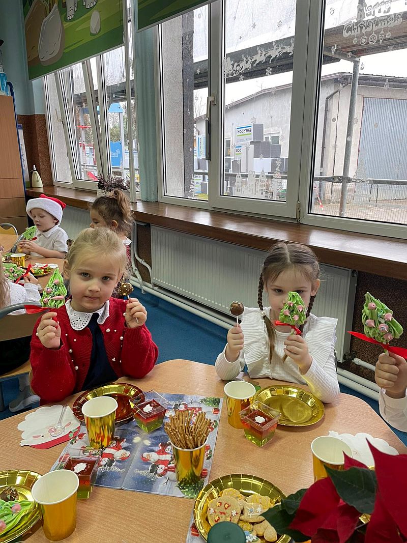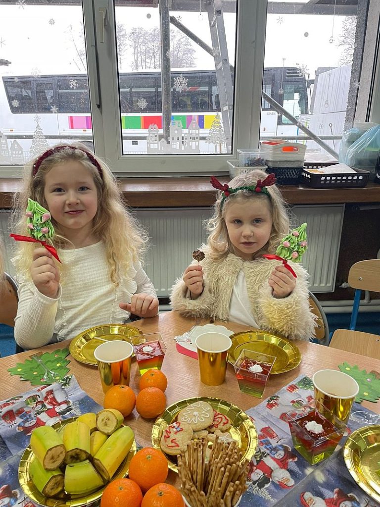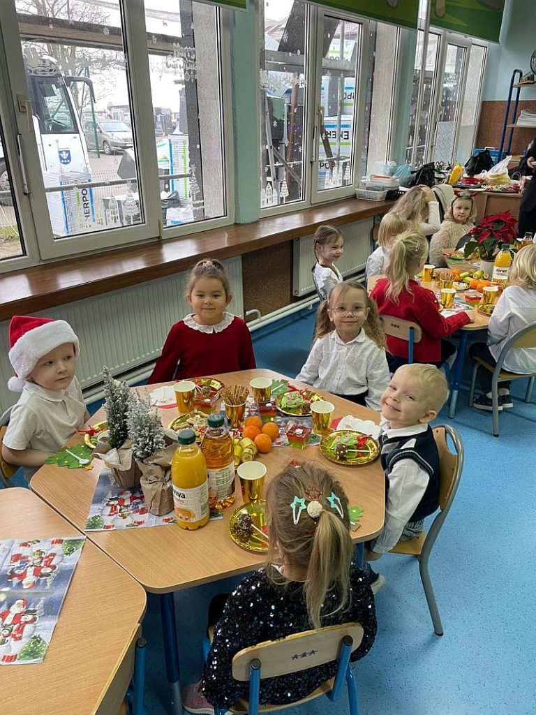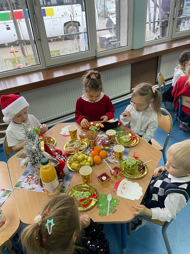 W grupie „Motylki” obchodziliśmy jeden z najpiękniejszych dni w roku – Wigilię Bożego Narodzenia. Dzieci dzieliły się opłatkiem, składały sobie życzenia, a następnie zasiadły do pięknie przystrojonego stołu, na którym czekał słodki poczęstunek. Nie zabrakło również wspólnego kolędowania. Czas upłynął w bardzo miłej atmosferze. Wszystkie dzieci czuły zbliżające się wielkimi krokami Święta Bożego Narodzenia.