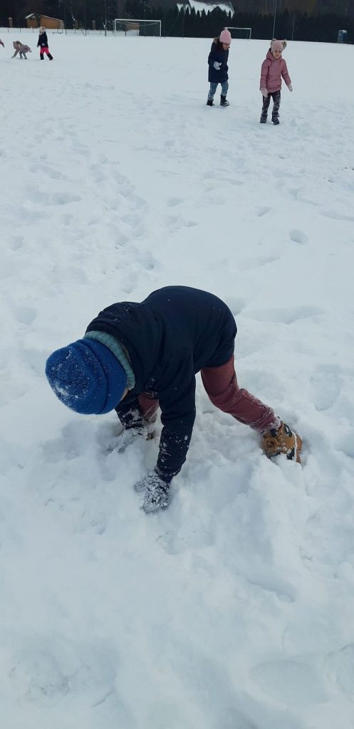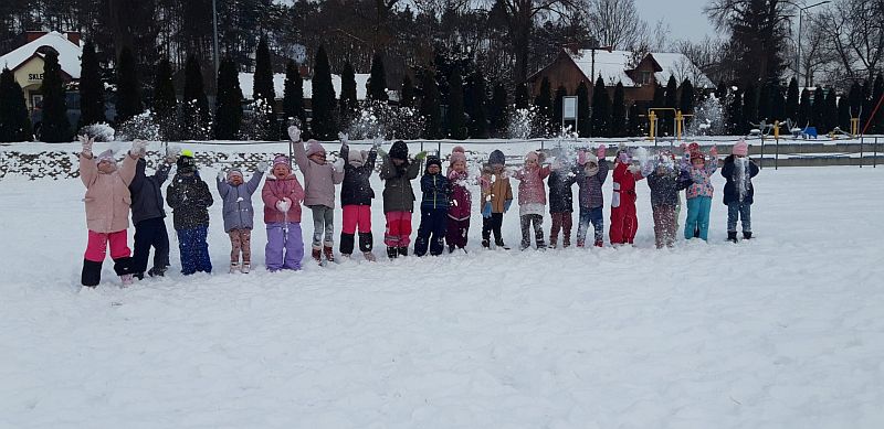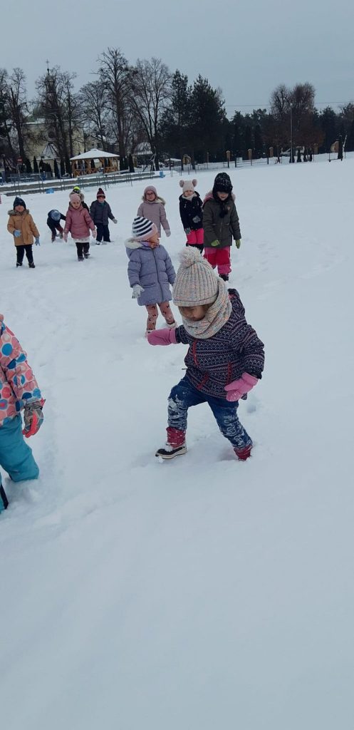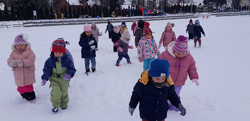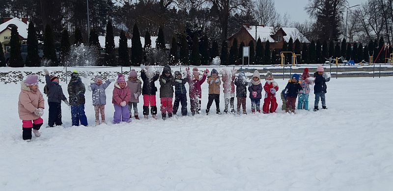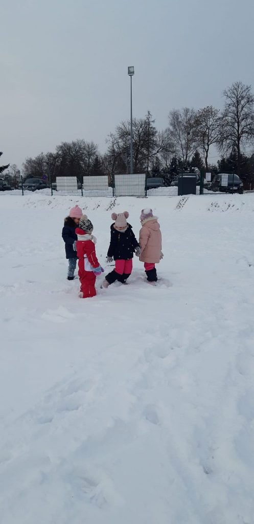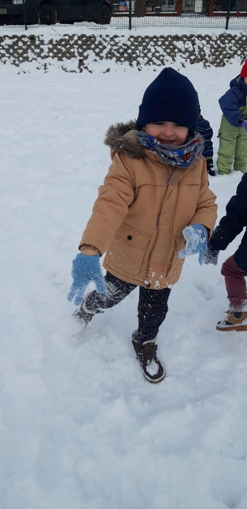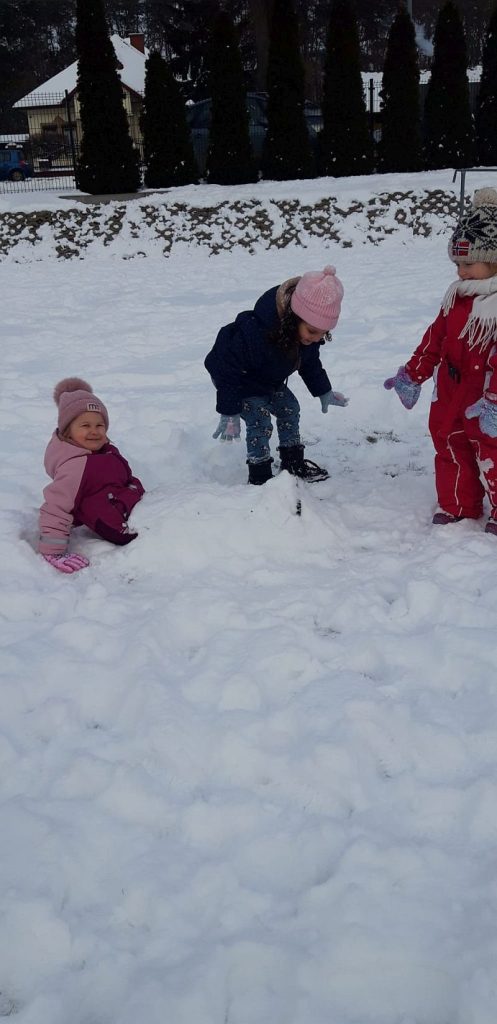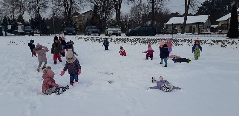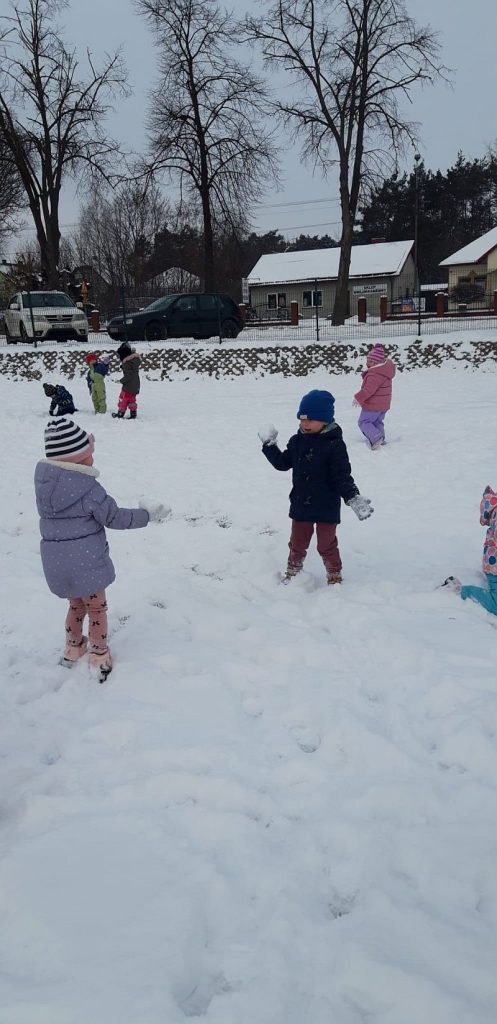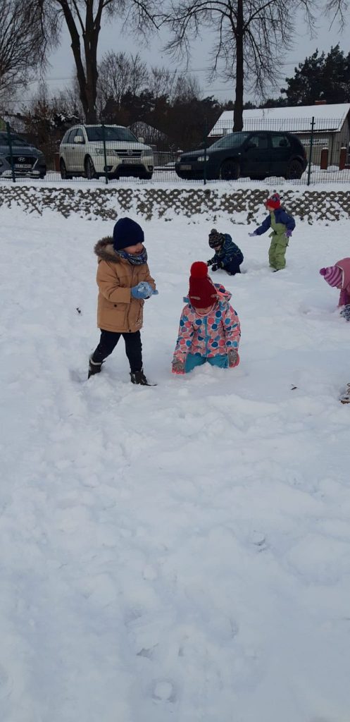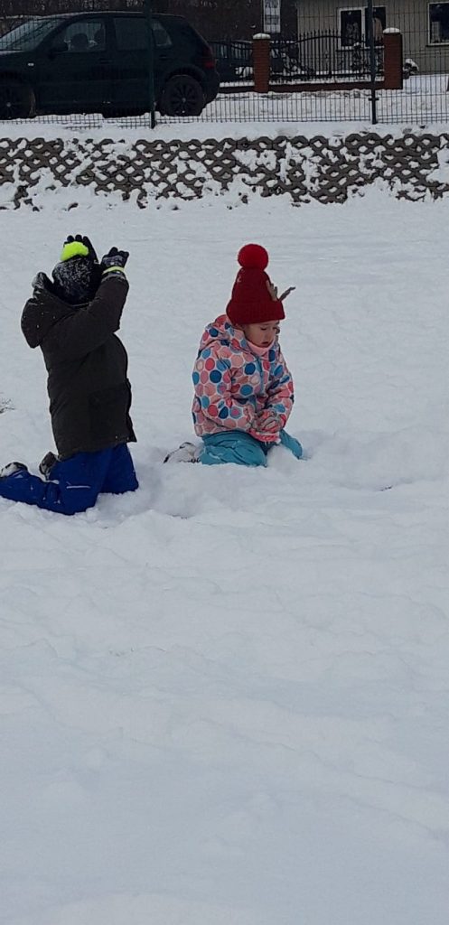 13 stycznia dzieci z grupy „Żabki” skorzystały z zimowej aury pogodowej i bawiły się w śniegu. Zabawy dały im mnóstwo radości od bitwy na śnieżki ,wydeptywanie kształtów ,wykonanie aniołków czy rysowanie palcem po śniegu.