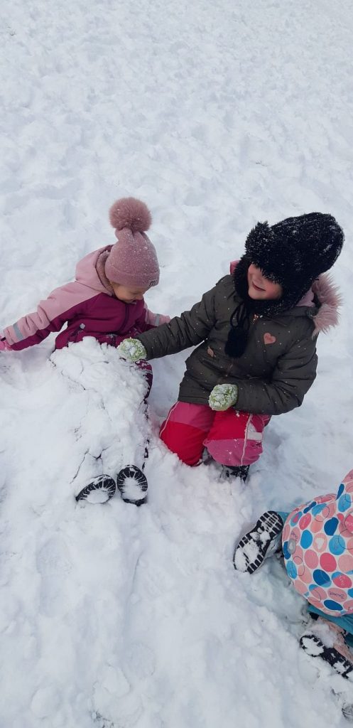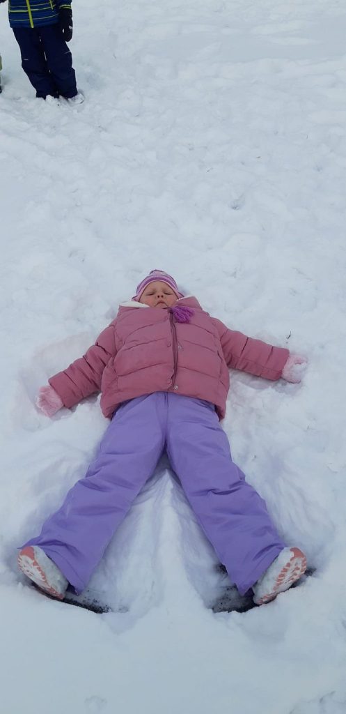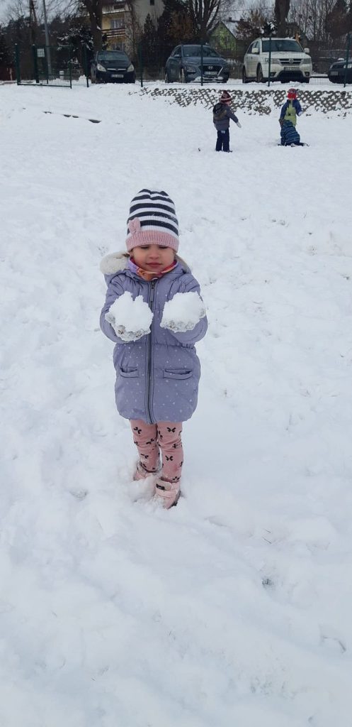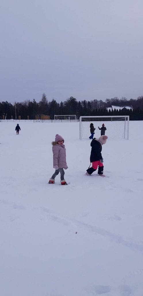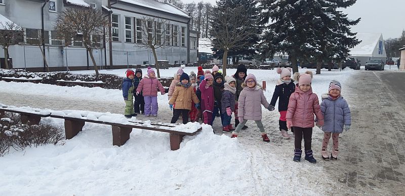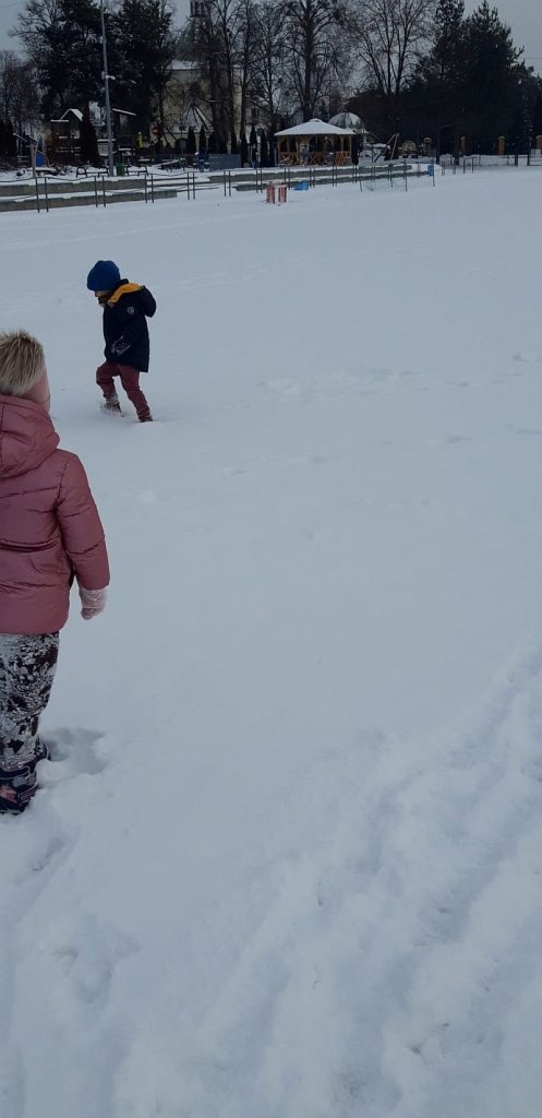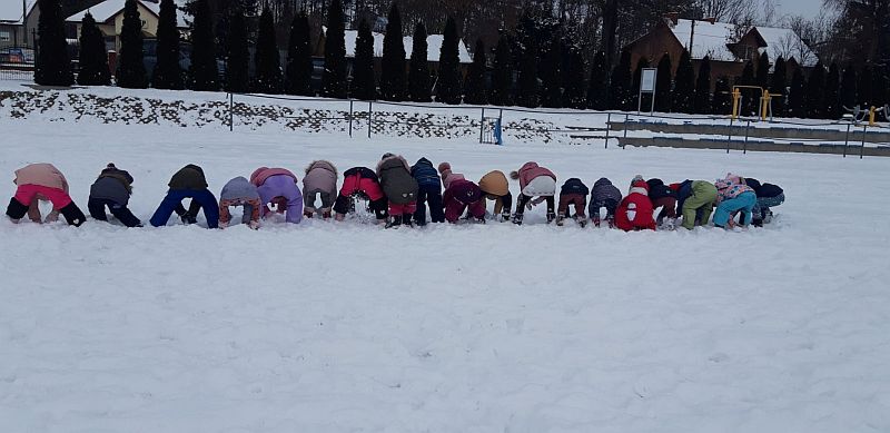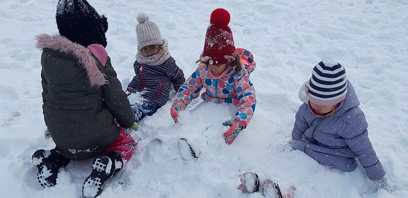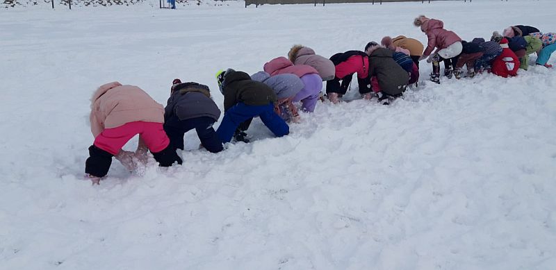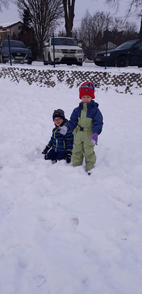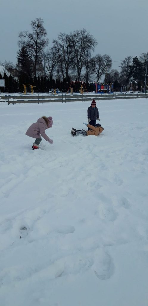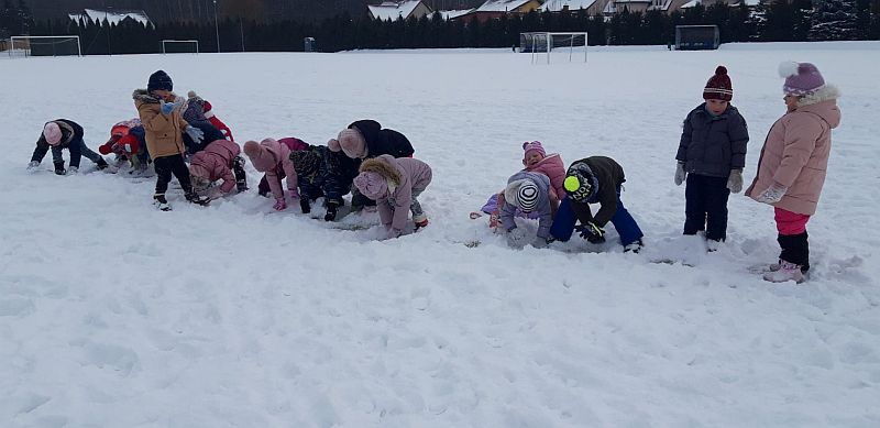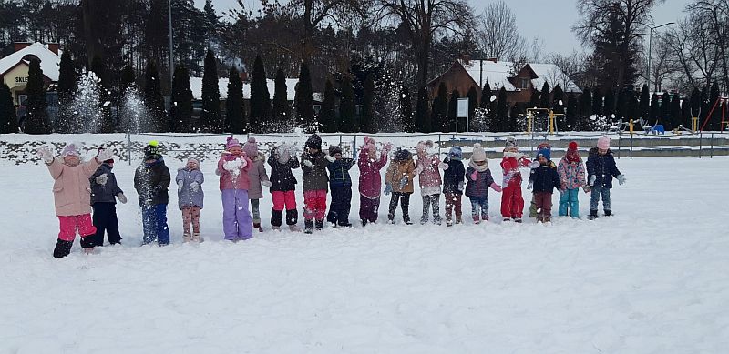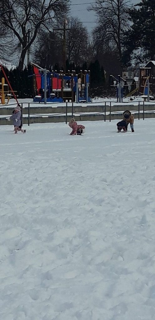 13 stycznia dzieci z grupy „Żabki” skorzystały z zimowej aury pogodowej i bawiły się w śniegu. Zabawy dały im mnóstwo radości od bitwy na śnieżki ,wydeptywanie kształtów ,wykonanie aniołków czy rysowanie palcem po śniegu.