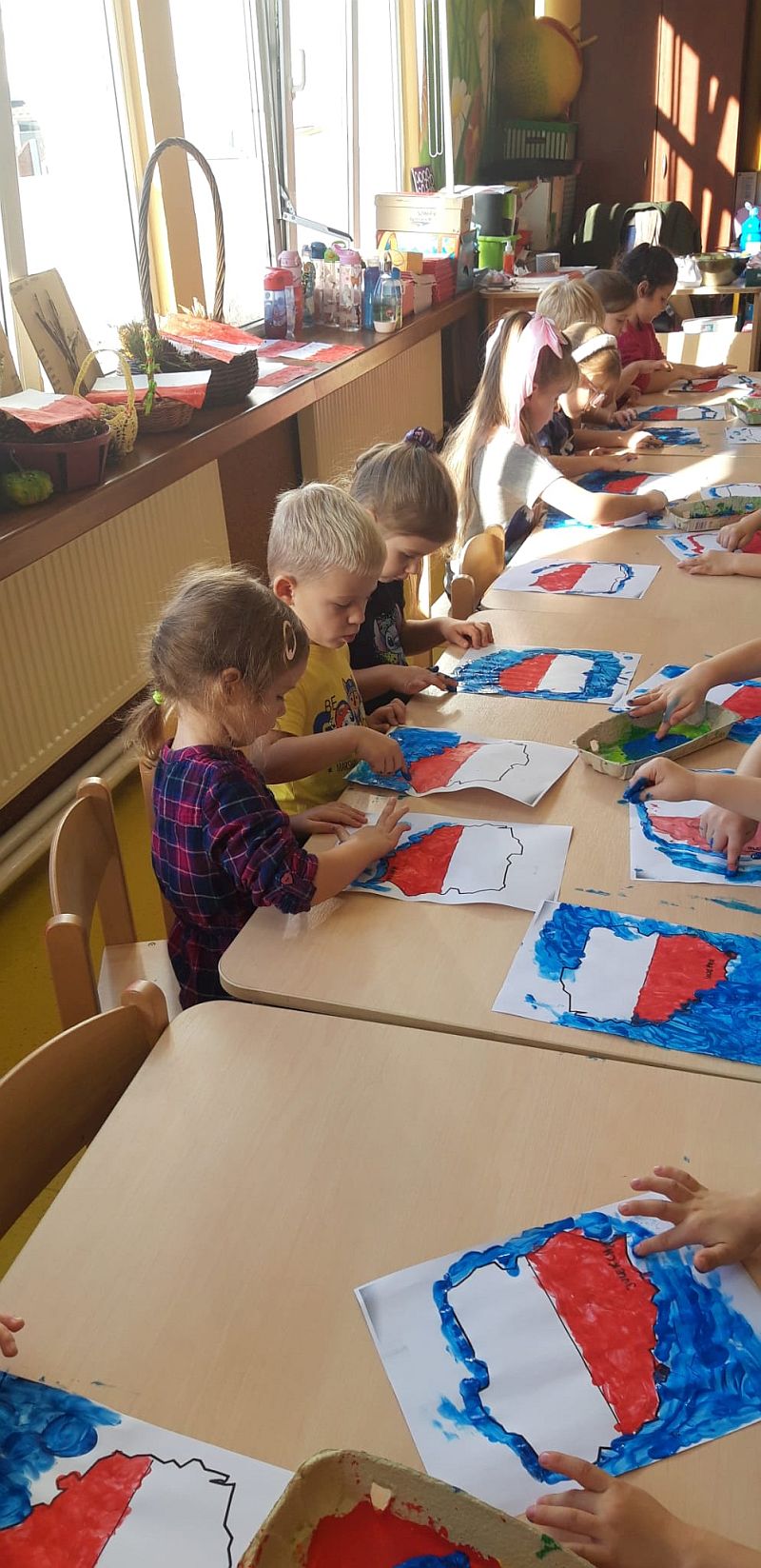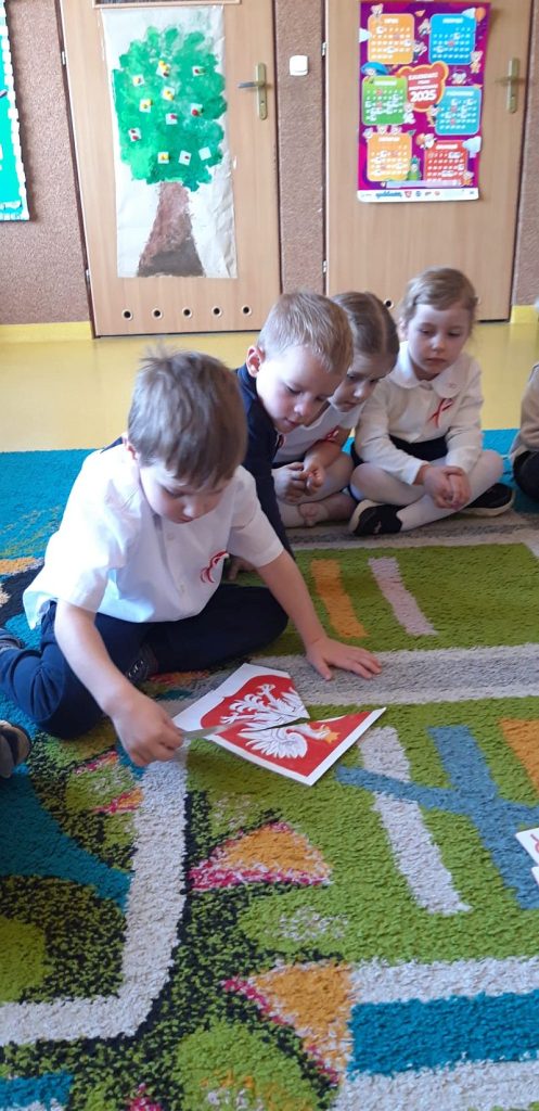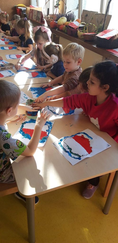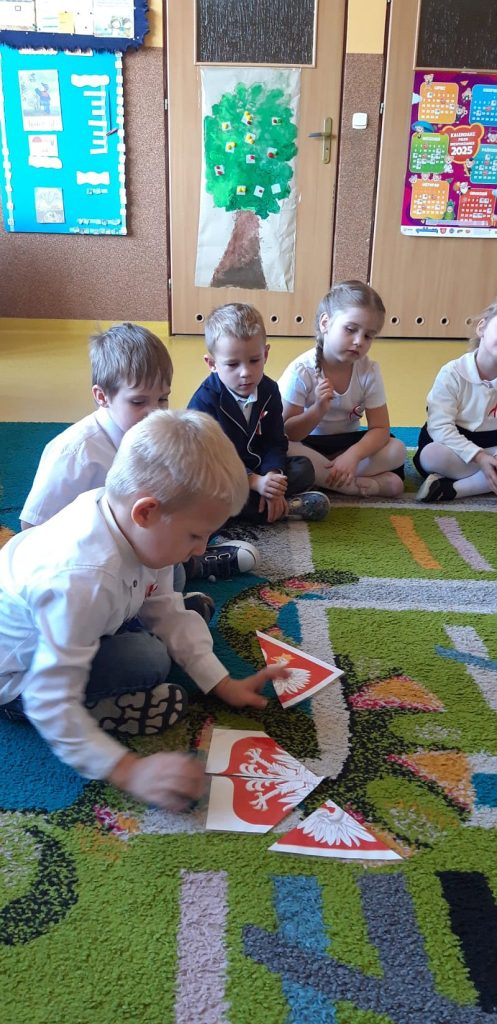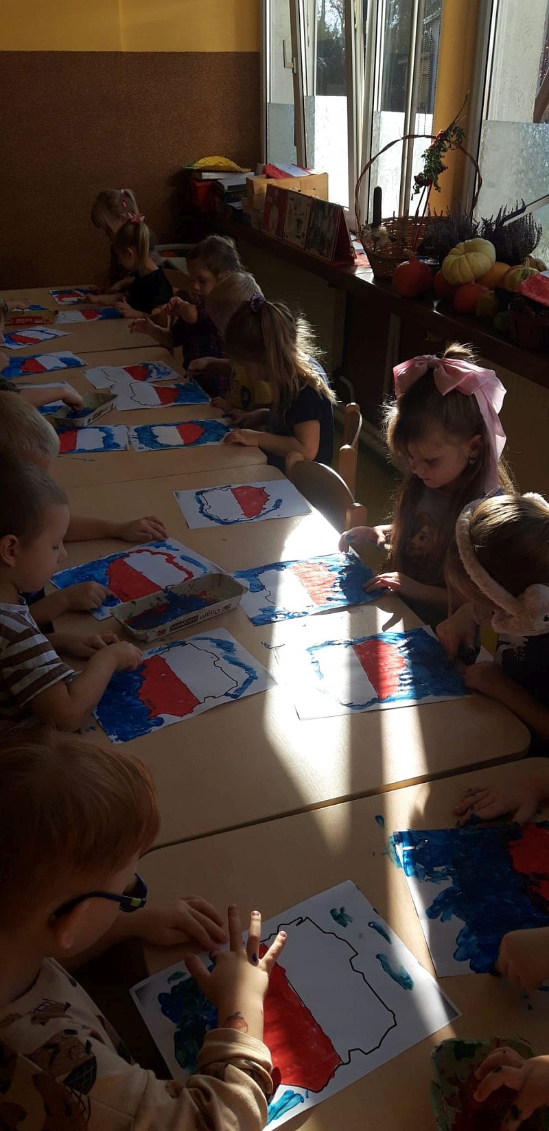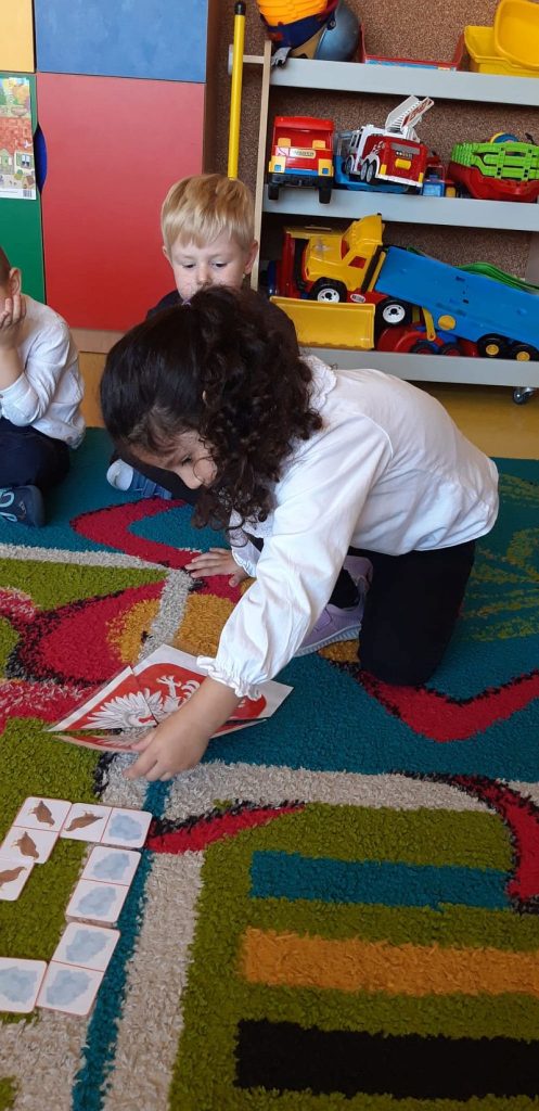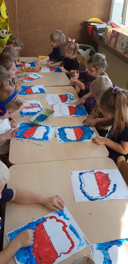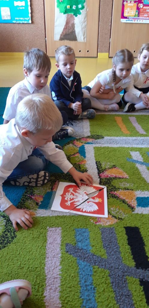 Polska to taka kraina, która się w sercu zaczyna…” to nie tylko zabawa, to nauka, przygoda i okazja do kształtowania miłości do naszej ojczyzny. Dzięki tym zajęciom, dzieci poczuły się dumne z bycia Polakami i odkryli, że Polska to miejsce pełne tajemnic, które warto poznać i szanować.” Na zajęciach śpiewaliśmy hymn Polski „Mazurek Dąbrowskiego” oraz piosenkę patriotyczną „Dzień niepodległości ” z rekwizytami z bibuły w kolorze bieli i czerwieni, układaliśmy domino oraz godło Polski a za pomocą spinaczy przenosiliśmy pompony w odpowiednich kolorach, do opakowań po jajkach, tak aby utworzyły flagę Polski. Wykonaliśmy pracę plastyczną -flagę oraz mapę Polski, rozwiązywaliśmy zagadki typu prawda- fałsz oraz uczestniczyliśmy w apelu z okazji rocznicy odzyskania Niepodległości.